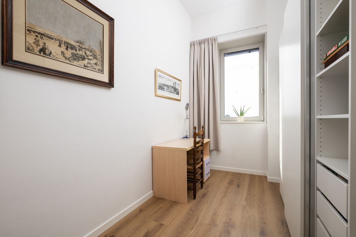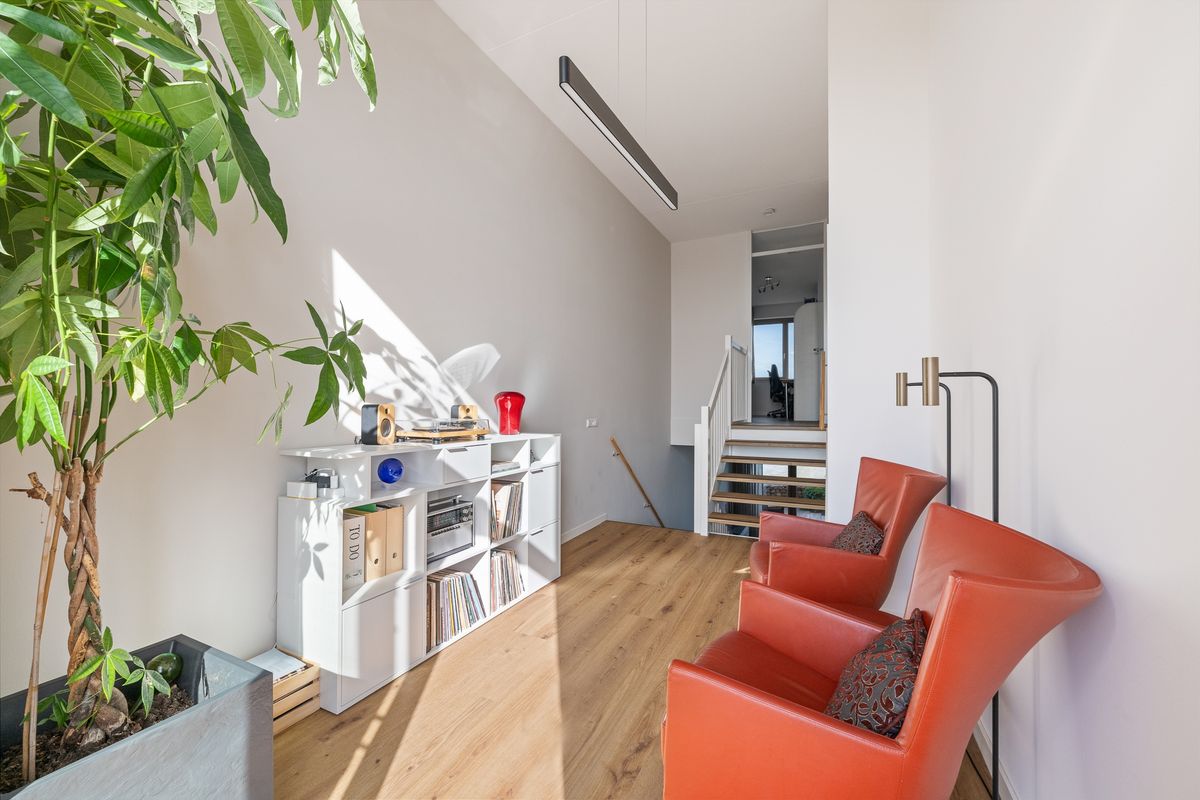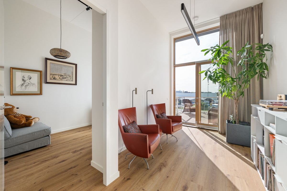 Op de volgende verdieping bevindt zich een open hobby- of werkruimte aan de voorzijde, met toegang tot het ruime terras via een schuifpui. Dit terras ligt op het zuidwesten, waardoor u hier de hele dag kunt genieten van de zon, maar door de screens de zon uit de kamers kunt houden. Daarnaast beschikt dit niveau over een ruime slaapkamer. Dankzij de plafondhoogte van maar liefst 3,66m voelt deze verdieping nog ruimtelijker aan.