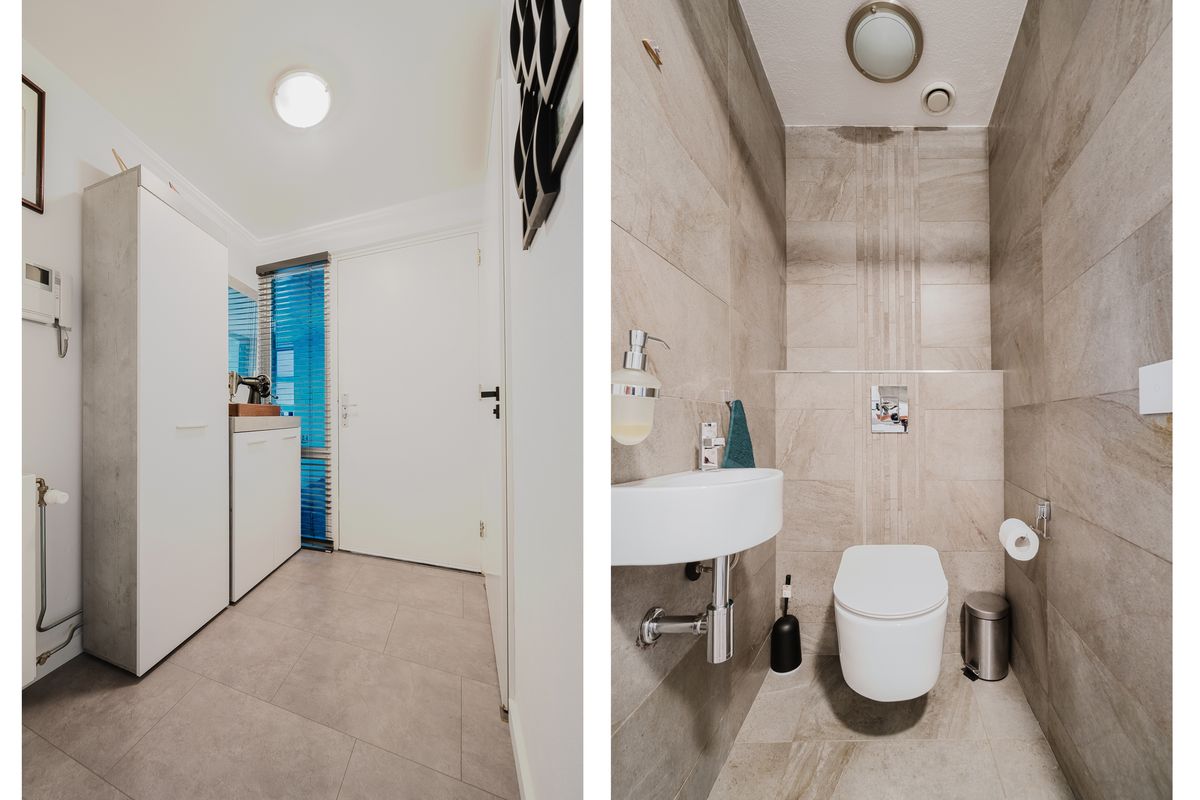 De woningentree biedt toegang tot de hal met garderobe en toegang tot het moderne toilet.