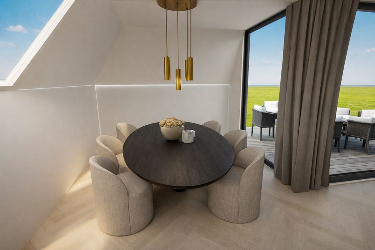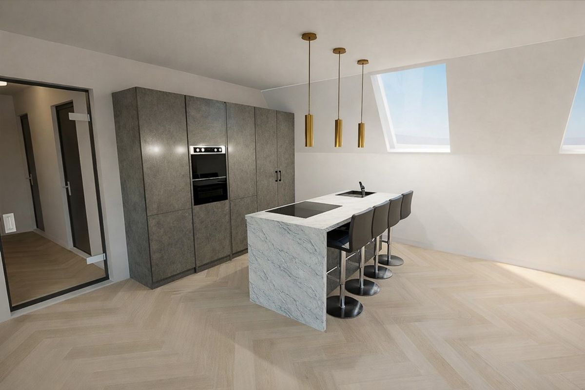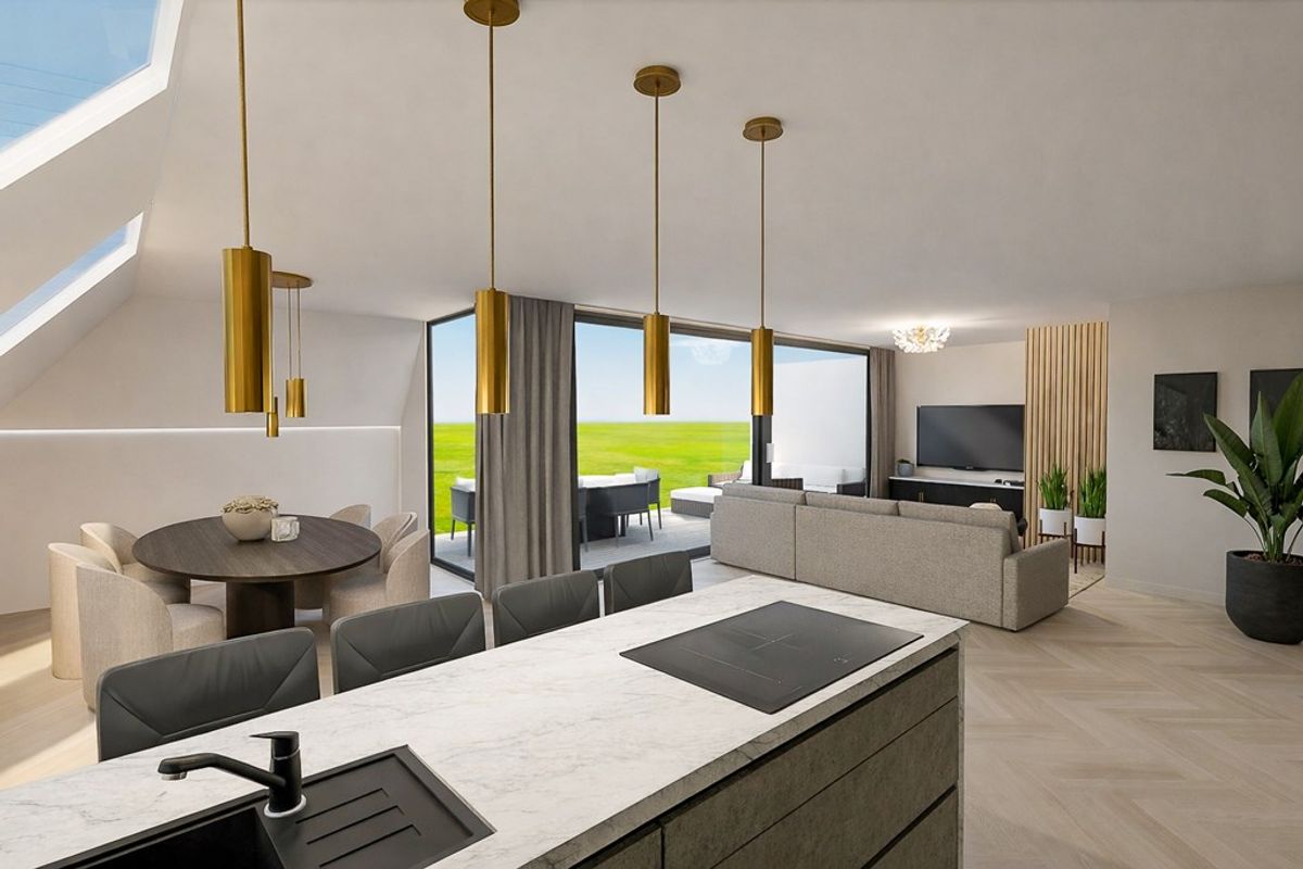 Het absolute hart van de woning wordt gevormd door de indrukwekkende leefruimte met woonkamer en open keuken van circa 73 m². Dankzij de royale raampartijen en de open opzet geniet deze ruimte van een prachtige lichtinval en een bijzonder ruimtelijk gevoel.