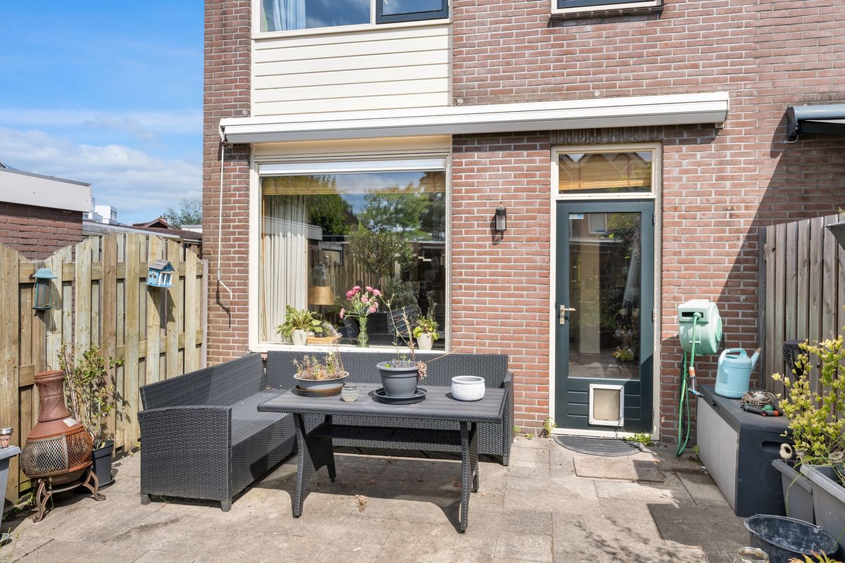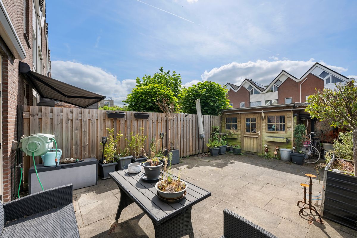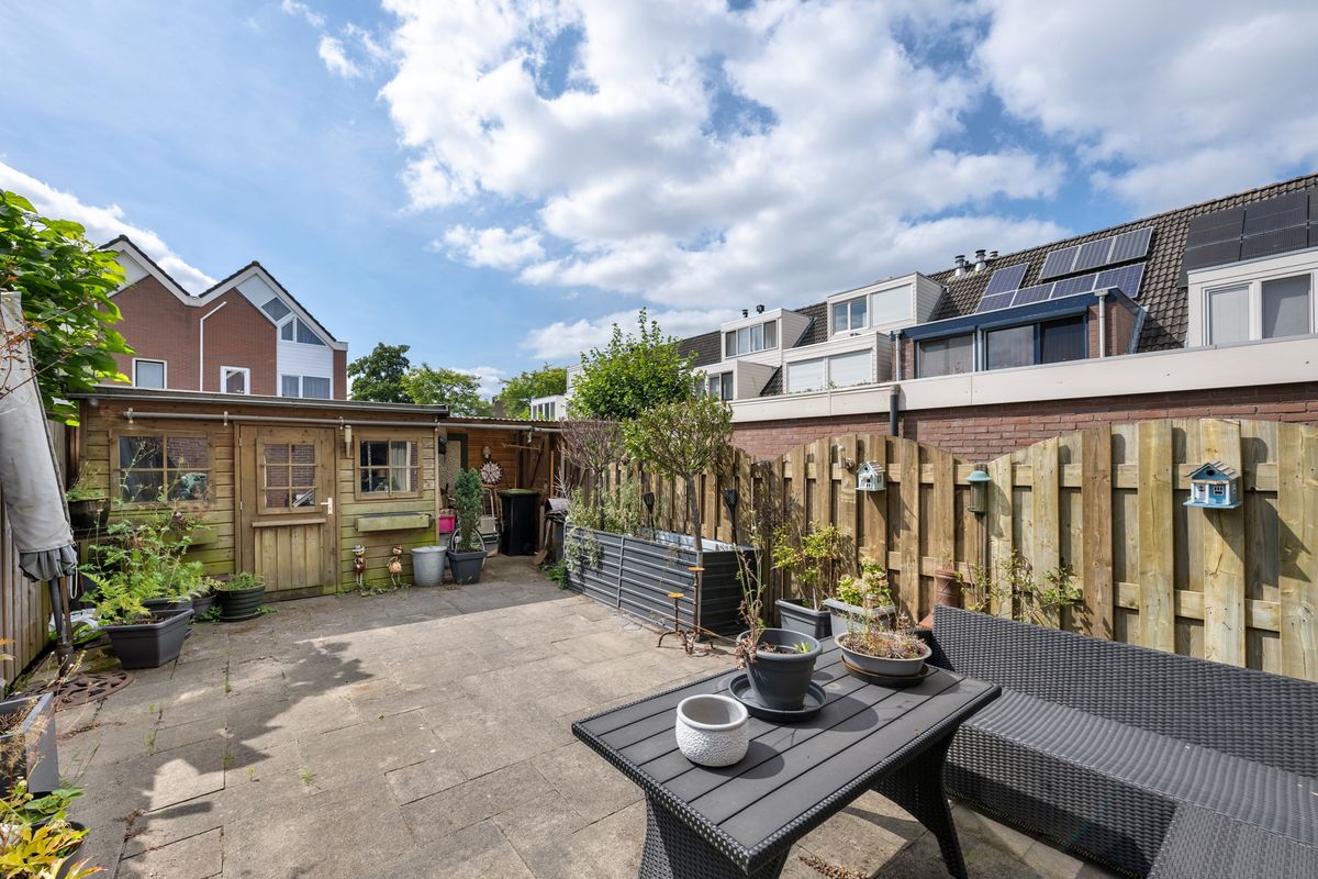 Heerlijk zonnige achtertuin op het zuidwesten. Als éxtra is in de tuin een berging gemaakt met een deur aan de zijkant. Nu kun je vanuit het pad dat naast het huis ligt met je motor de berging inrijden. Heel handig dus!