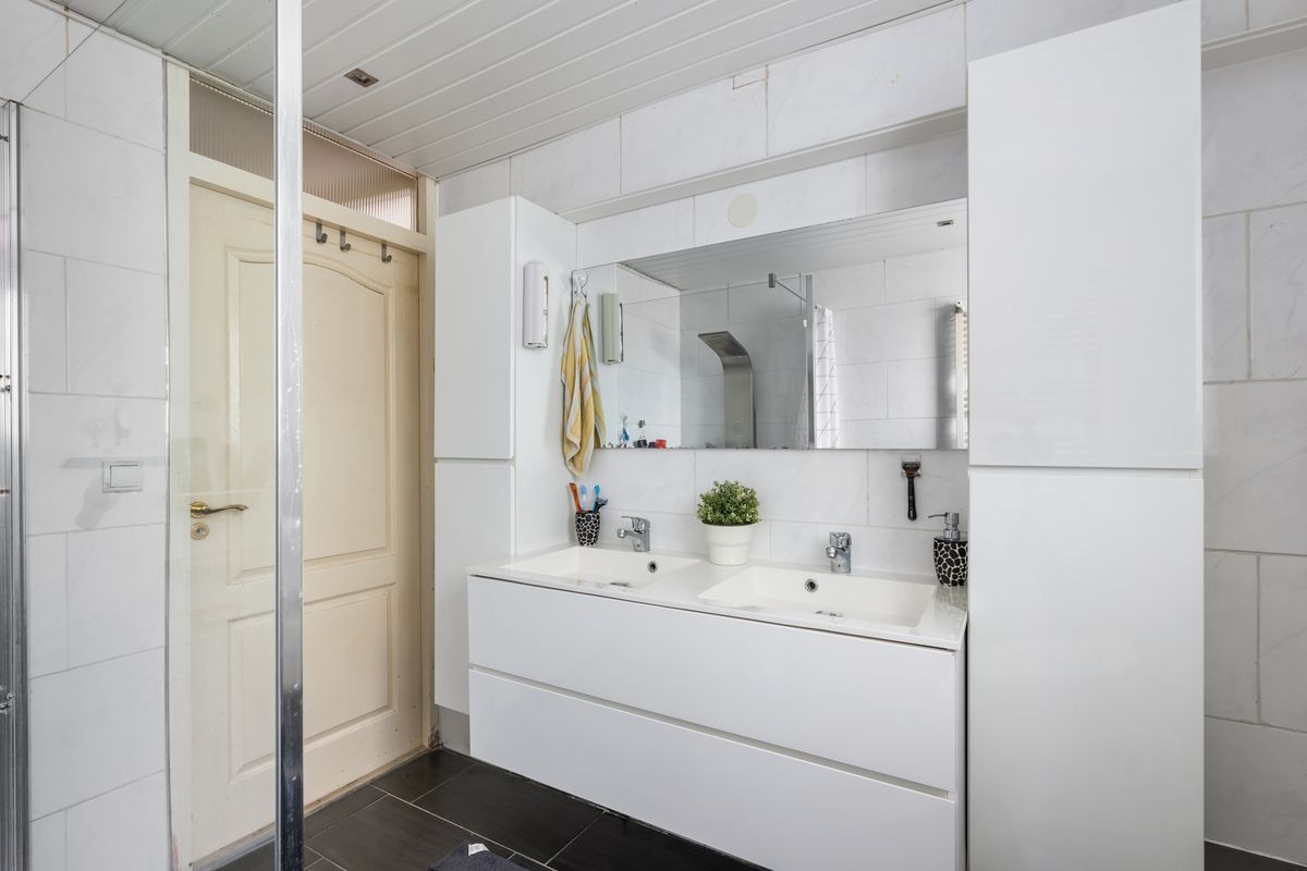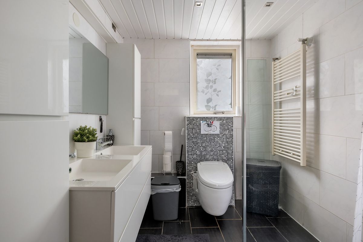 Gemoderniseerde badkamer met douche, wastafelmeubel en toilet.