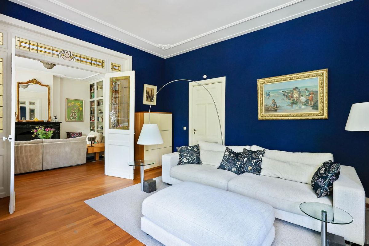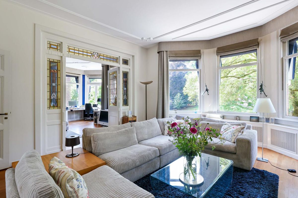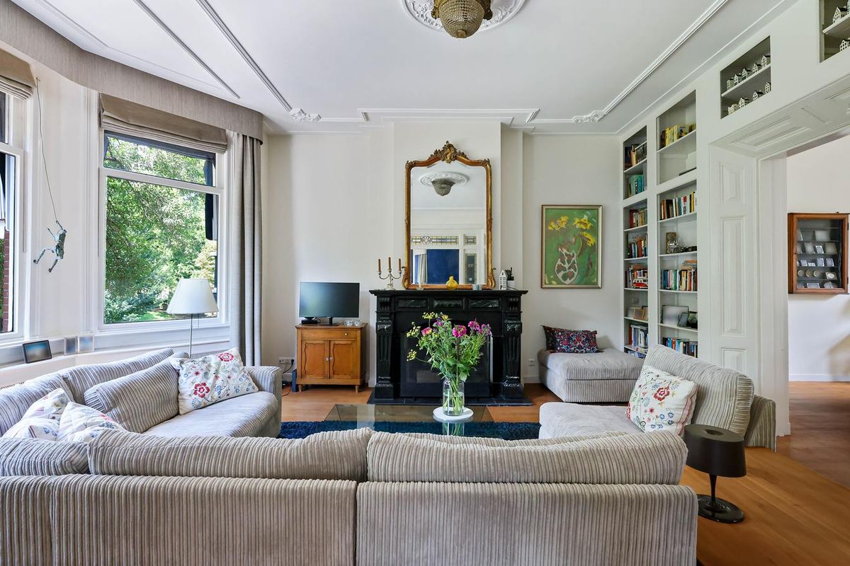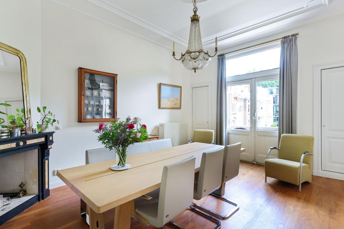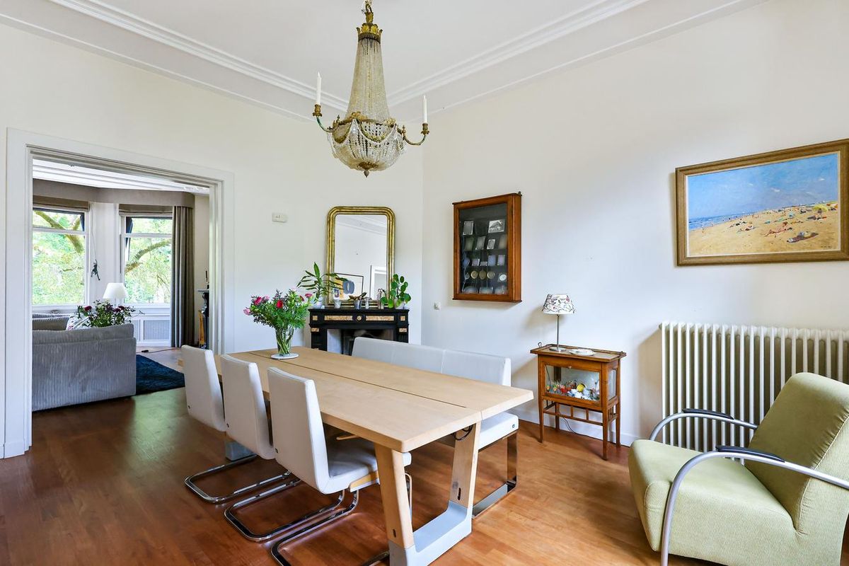 De living en-suite bevindt zich op de eerste etage. Een prachtig lichte leefruimte met een authentieke schouw, fraaie houten vloer en toegang tot maar liefst twee terrassen. U heeft vanaf deze royale terrassen prachtig uitzicht in het groen. Ook aan de voorzijde van het object heeft u een schitterend uitzicht richting de singel. Uniek voor stadse begrippen!