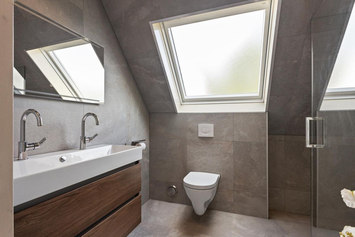 De moderne badkamer is vernieuwd in 2020 en voorzien van een wastafelmeubel met 2 kranen, inloopdouche met regendouche en vrijhangend toilet.
