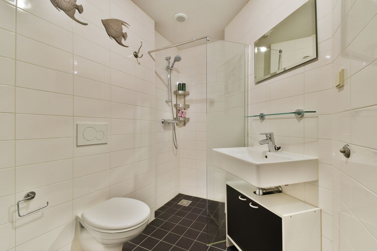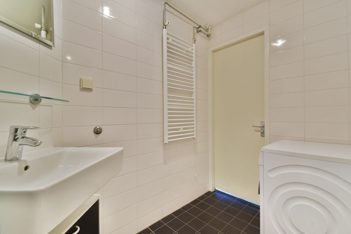 • Bathroom with shower, washbasin unit, toilet, and washing machine connection