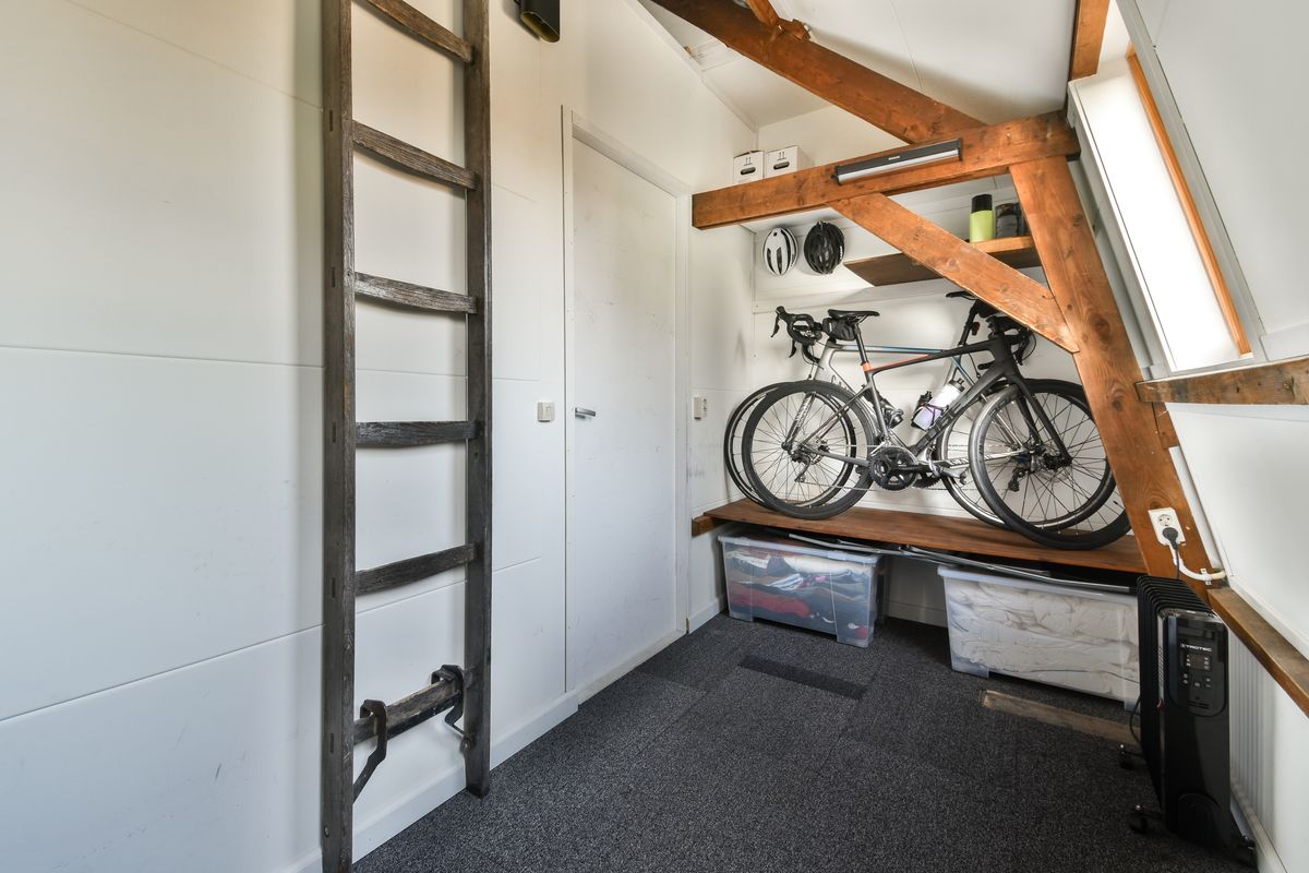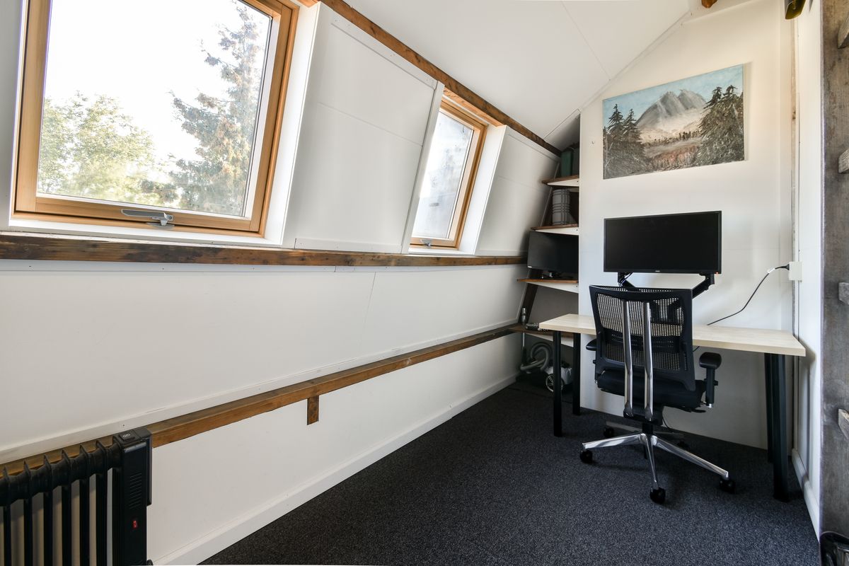 Met toestemming van VvE en gemeente is de berging op de vierde verdieping verbouwd tot werkkamer. De twee ramen, geïsoleerde wanden en het hoge plafond zorgen ervoor dat je hier heerlijk rustig werkt. Daarnaast is er ook nog ruimte over om spullen op te bergen.