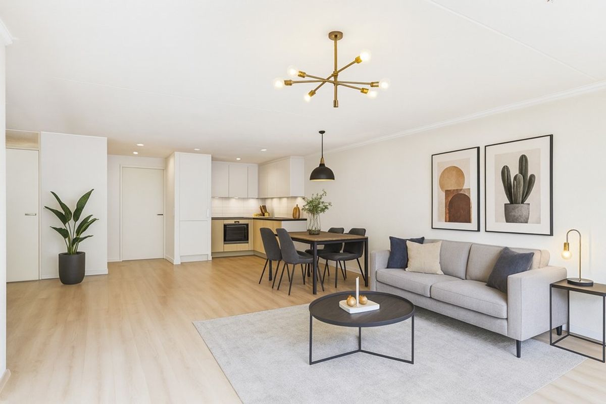 Bij binnenkomst van de hal is de eerste deur aan de rechterzijde de toegang tot het appartement. Een royale hal geeft toegang tot alle ruimtes. De woonkamer met open keuken is aan de voorzijde gelegen met een heerlijk uitzicht. Doordat er momenteel een slaapkamer bij de woonkamer getrokken is geeft dit een geweldige leefruimte. Door het plaatsen van een wand is de slaapkamer weer eenvoudig terug te brengen.