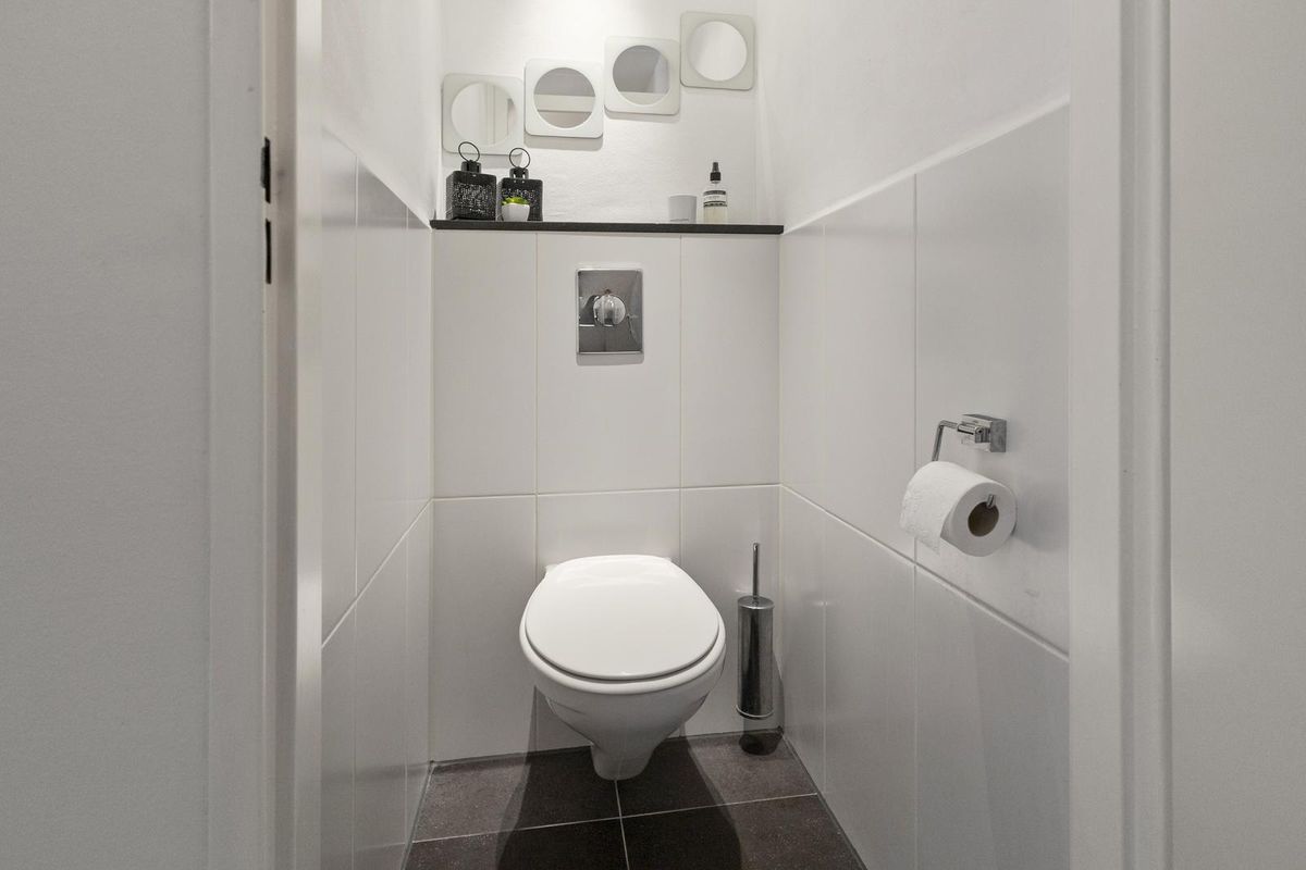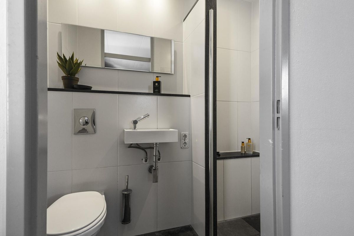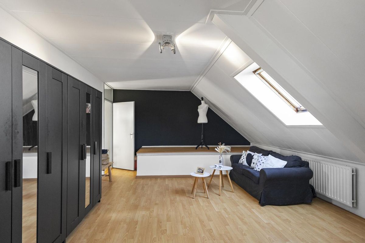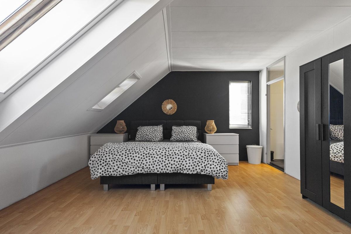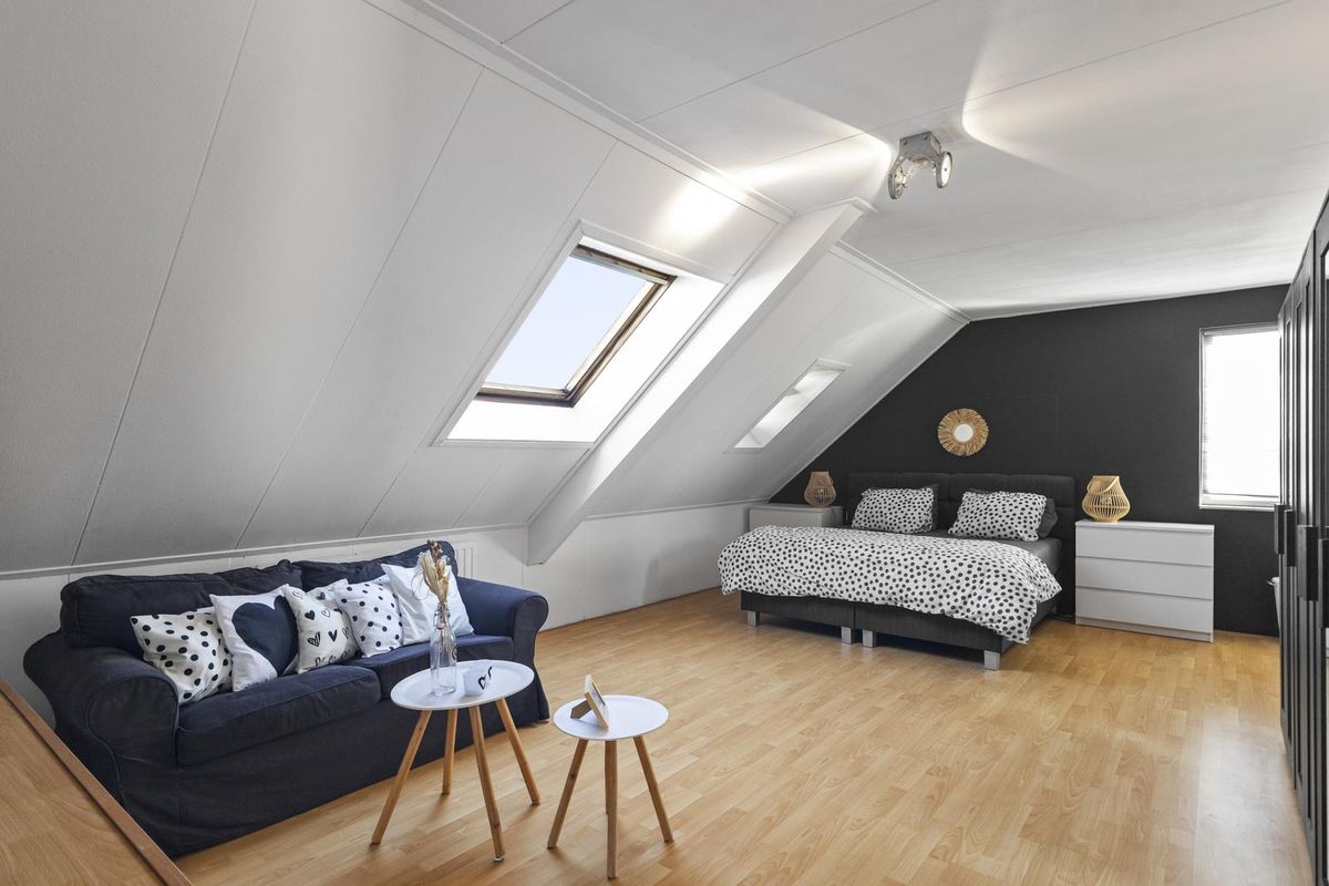 Op de verdieping is een zeer riante slaapkamer gelegen met 2 dakramen en toegang tot de 2e badkamer met douche met glazen deur en een drain, een vrijdragend toilet en een klein wasbakje.