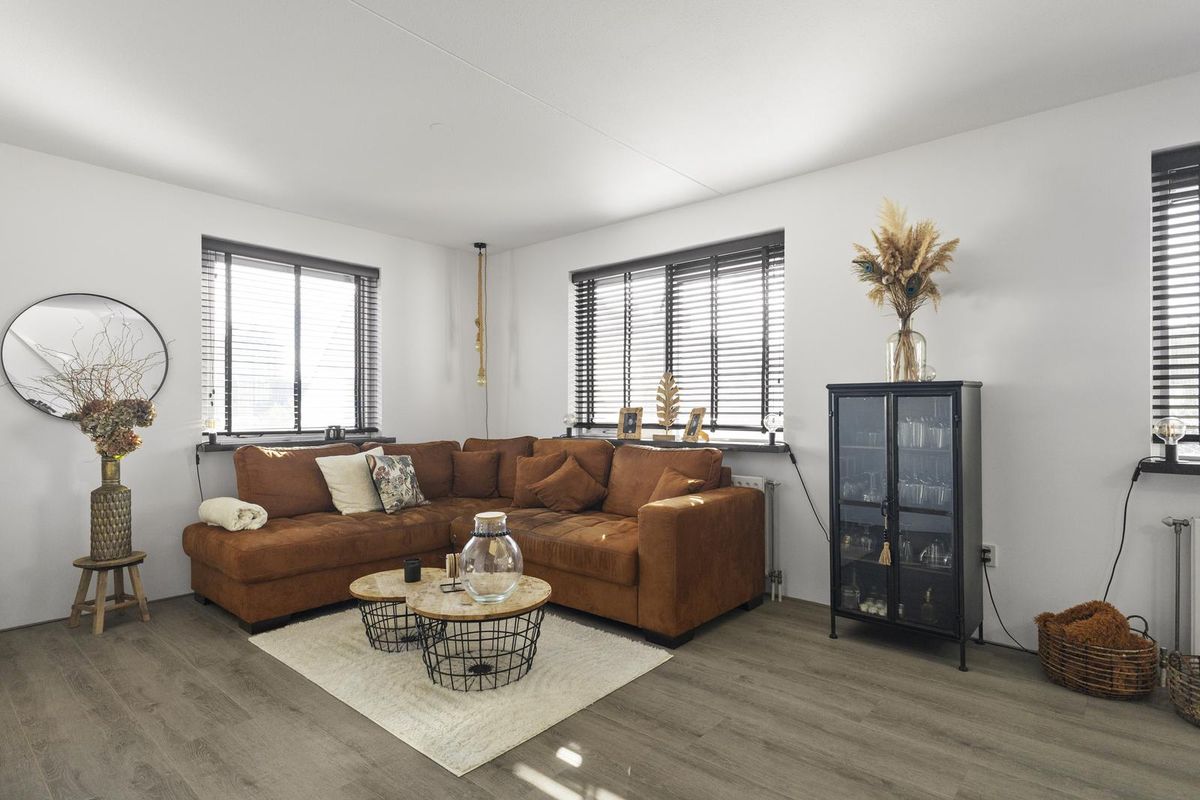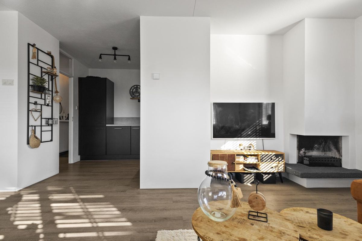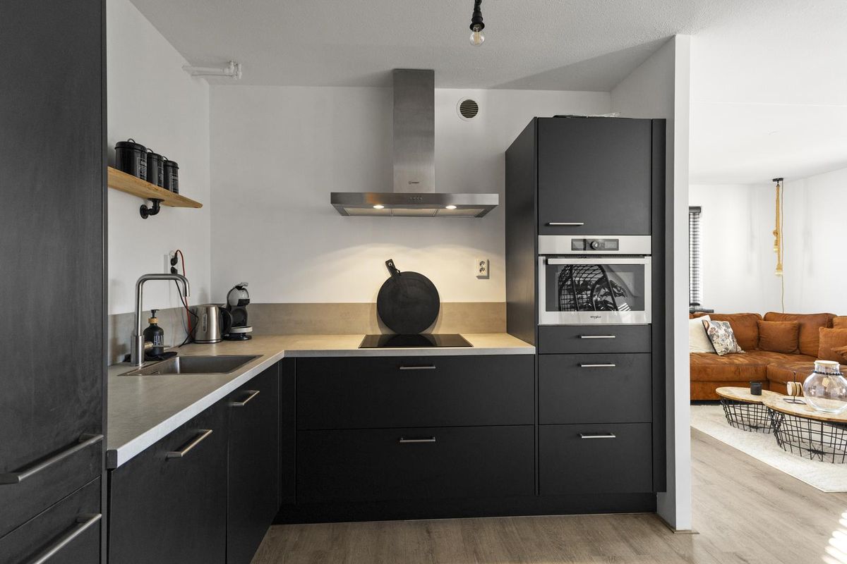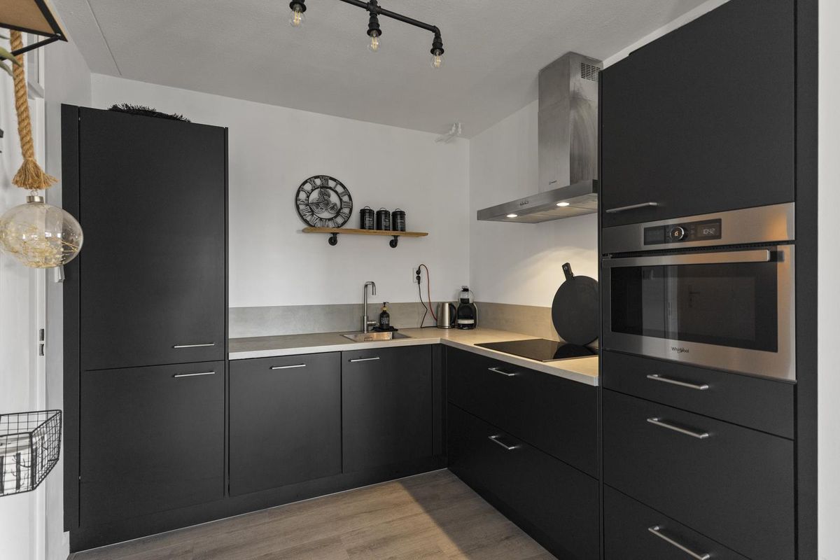 Aan de achterzijde de keuken in hoekopstelling en zwarte kleur (ca. 6 jaar oud) en voorzien van een afzuigkap, inductiekookplaat, vaatwasser, koelkast, vriezer en combimagnetron.