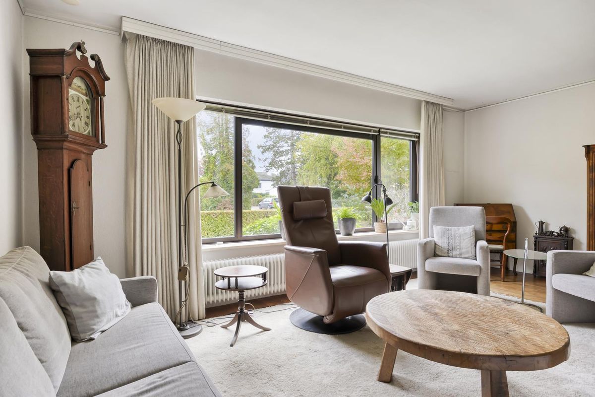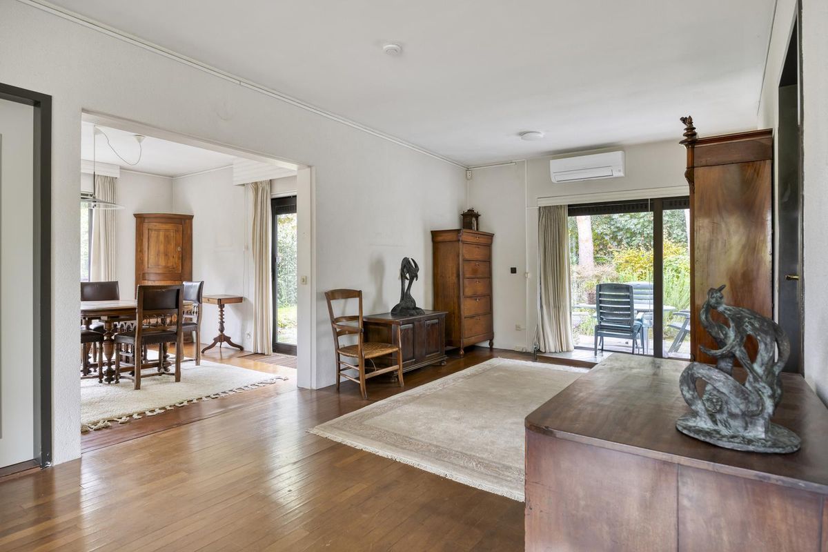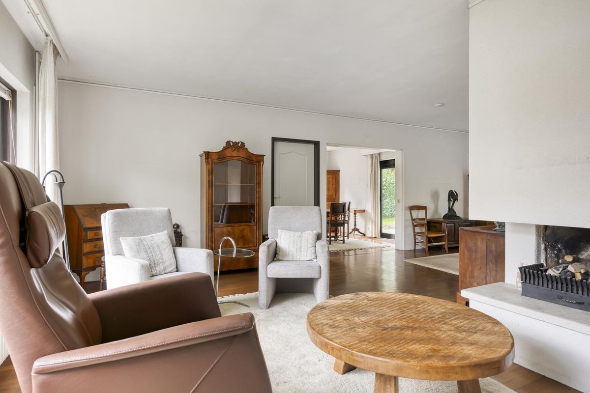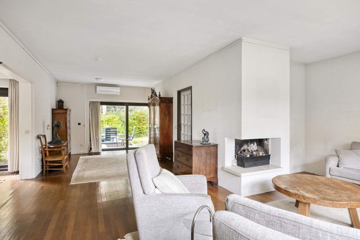 De zeer ruime woonkamer is van de voorzijde naar de achterzijde van de woning gelegen in een L-vorm en biedt aan de voorzijde door een grote raampartij een uitstekende lichtinval. In de woonkamer bevindt zich de schouw met open haard en aan de achterzijde is er een schuifpui naar de tuin. U heeft dus zowel een heerlijk uitzicht over de voortuin en de straatzijde als over de achtertuin, waardoor u zich in het bos waant.