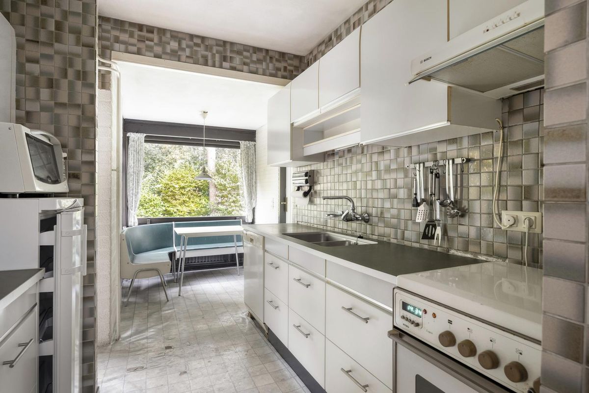 De keuken ligt net als het eetgedeelte aan de achterzijde van de woning en heeft op dit moment een eenvoudige inrichting met onder- en bovenkasten. Er is een aparte hoek gerealiseerd die perfect is voor het ontbijt of als u bijvoorbeeld aan het werk met de laptop of het lezen van een boek wilt genieten van de tuin.