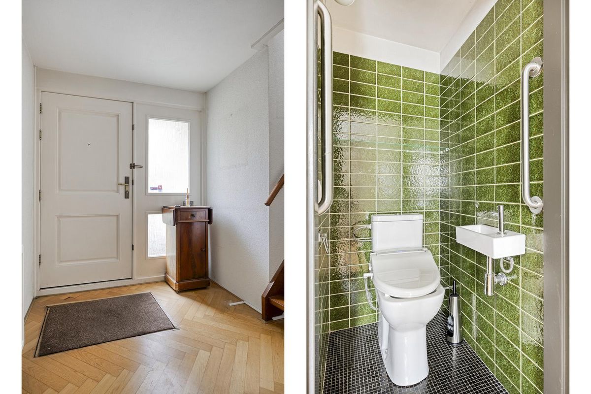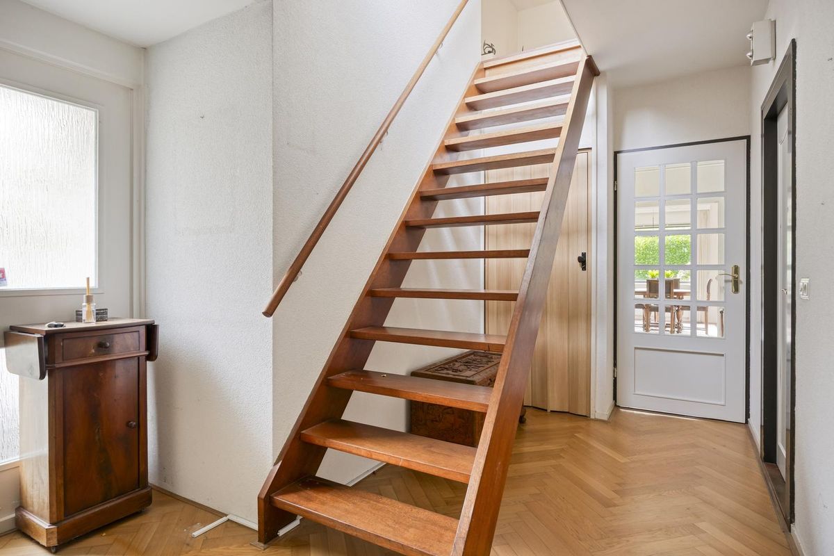 De ruime hal biedt direct toegang tot de 1e verdieping via de open trapopgang. Tevens zijn de woonkamer en de keuken toegankelijk vanuit de hal. Daarnaast vindt u hier de toiletruimte en de meterkast.