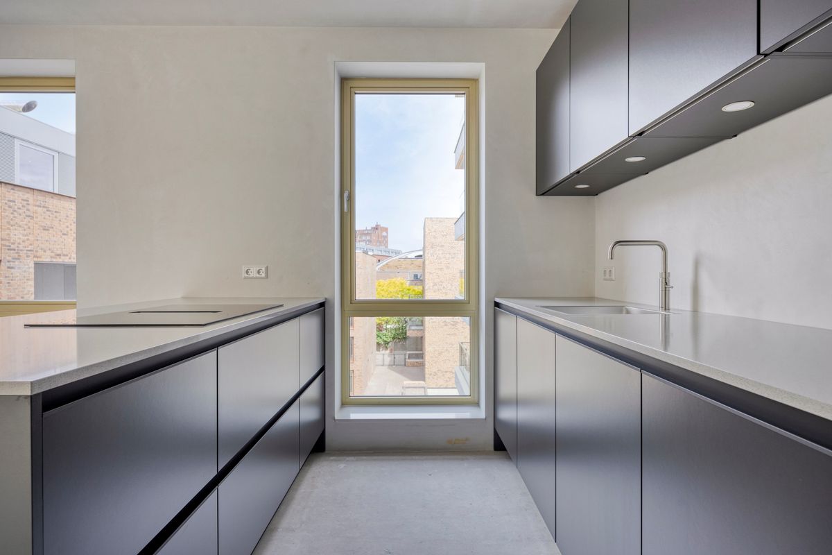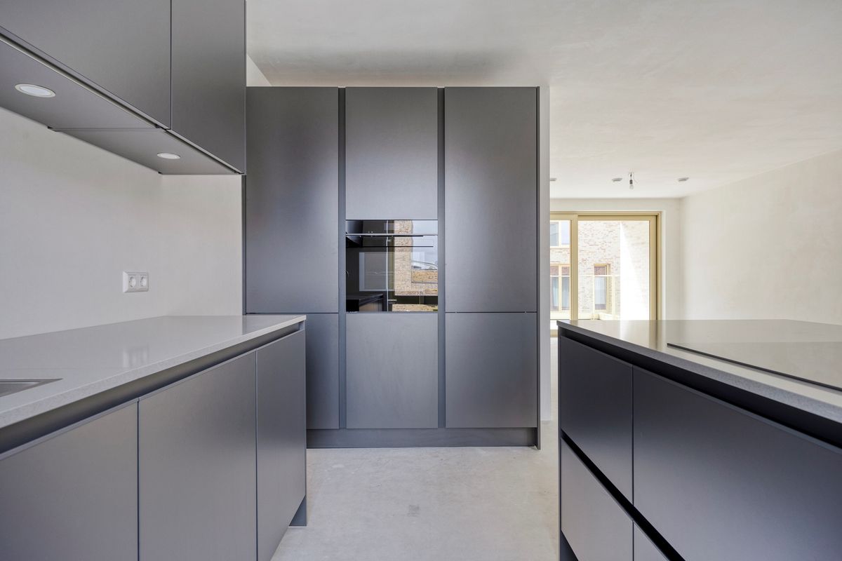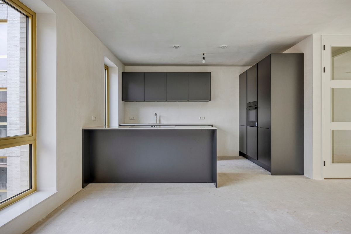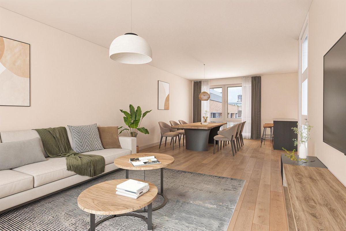 Aan het einde van de gang kom je in de woonkamer met open keuken als centraal punt van de woning. Een brede, lichte ruimte met grote raampartijen. De zithoek ligt aan de balkonzijde en biedt alle ruimte om comfortabel te wonen. De luxe keuken en de eethoek sluiten daar perfect op aan: open, maar overzichtelijk en gezellig.