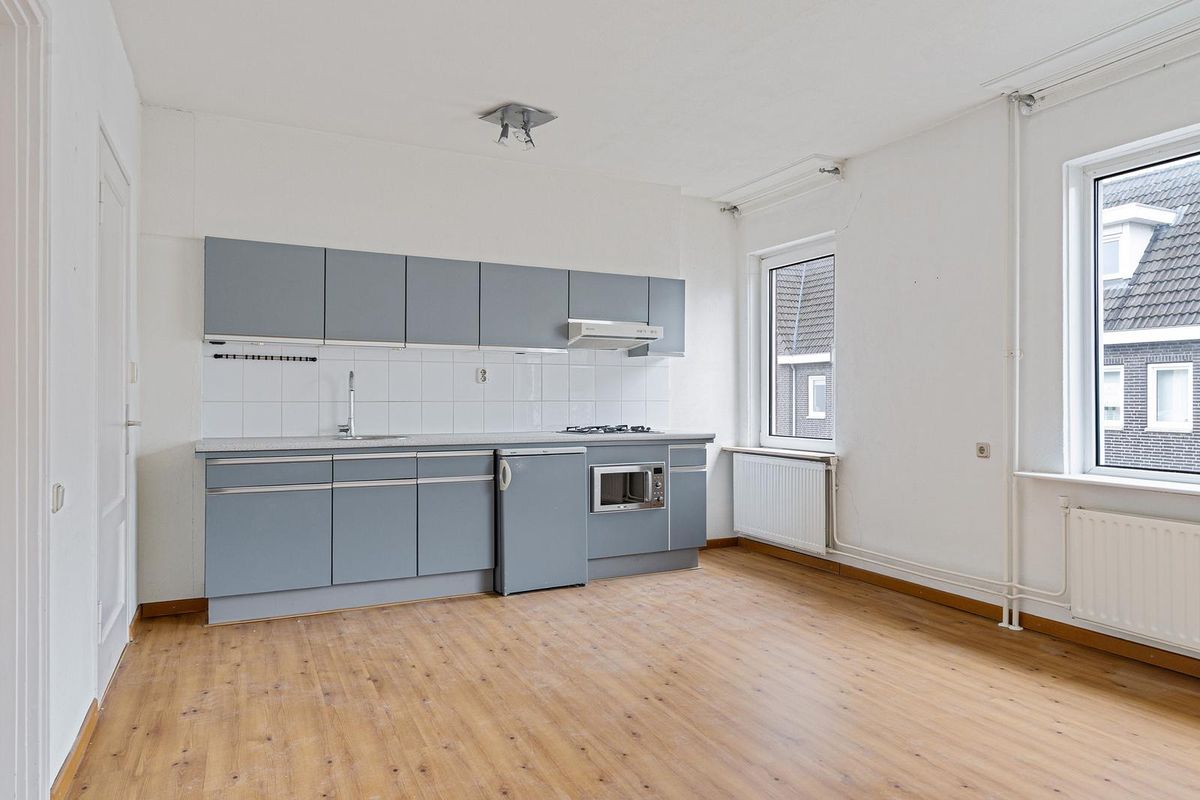 De trap met bordes en raam leidt naar de eerste verdieping. Hier kom je op een overloop die toegang biedt tot een royale woonruimte met open keuken en trap naar de tweede verdieping. De keuken is voorzien van een 4-pits fornuis, afzuigkap, combi-magnetron/oven, koelkast, spoelbak en boven- en onderkasten.