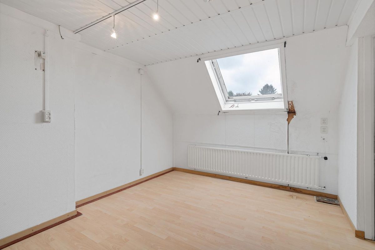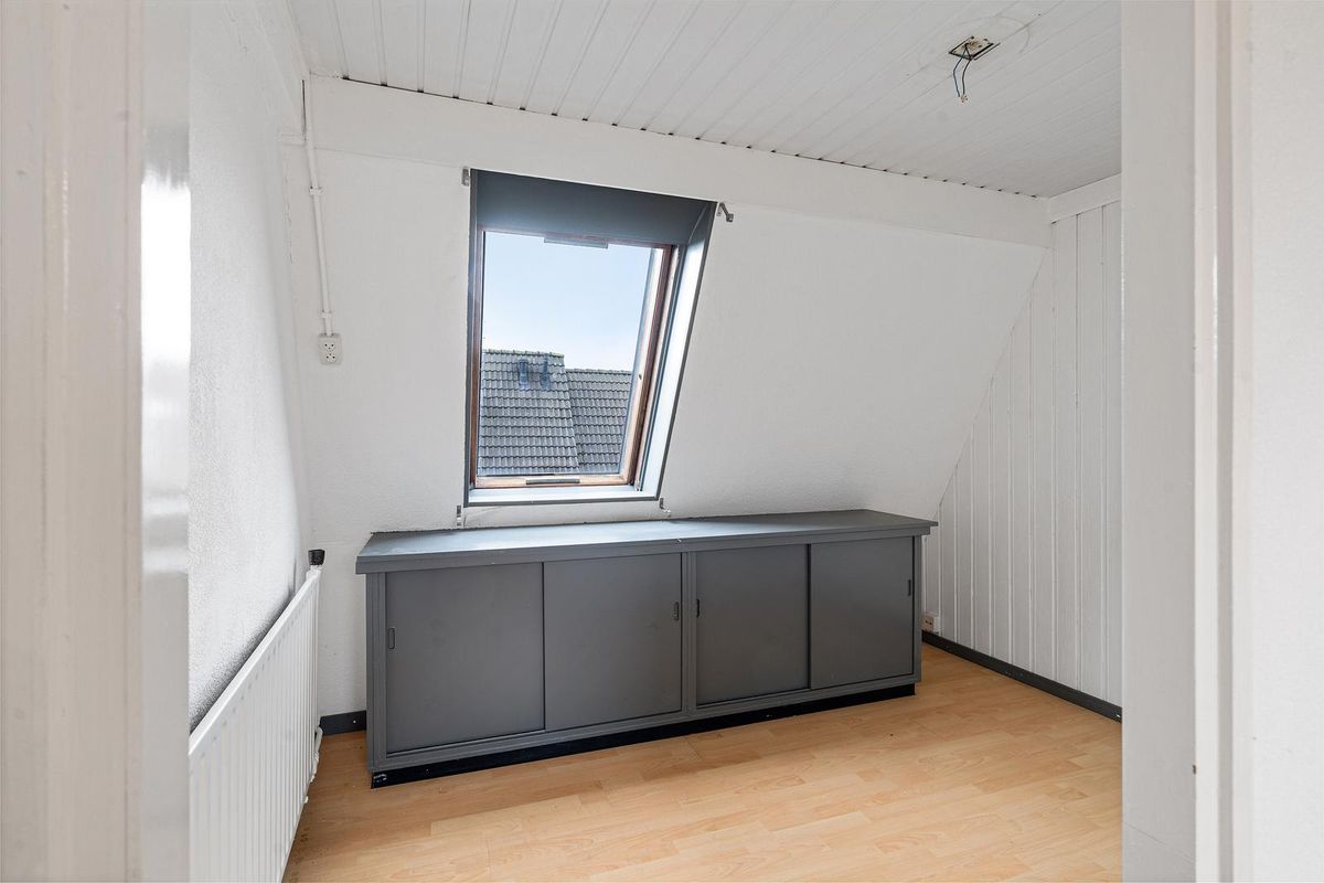 De trap naar de tweede verdieping heeft een bordes met dakraam, wat zorgt voor extra lichtinval. Vanaf de overloop zijn twee slaapkamers en een muurkast bereikbaar.