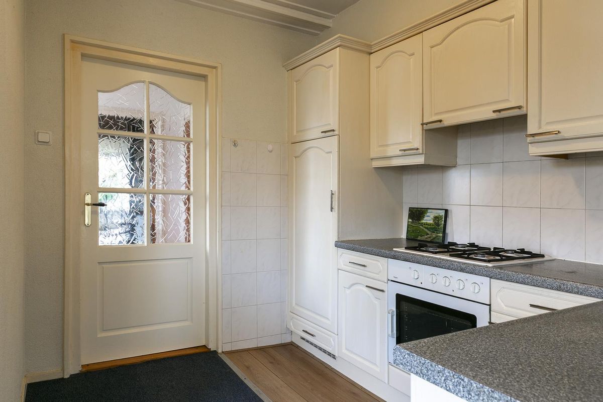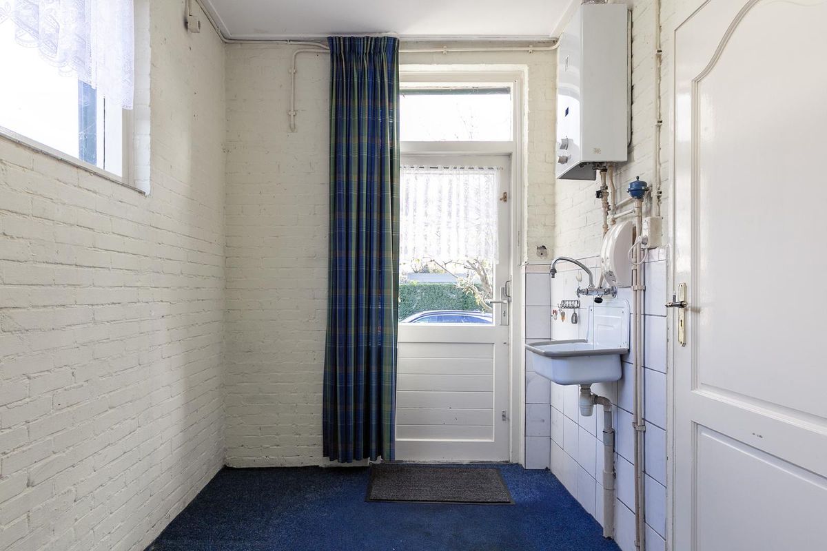 Volledig aan de achterzijde van de woning treffen we de bijkeuken aan, hier treffen we de wasmachine en droger aansluiting aan.