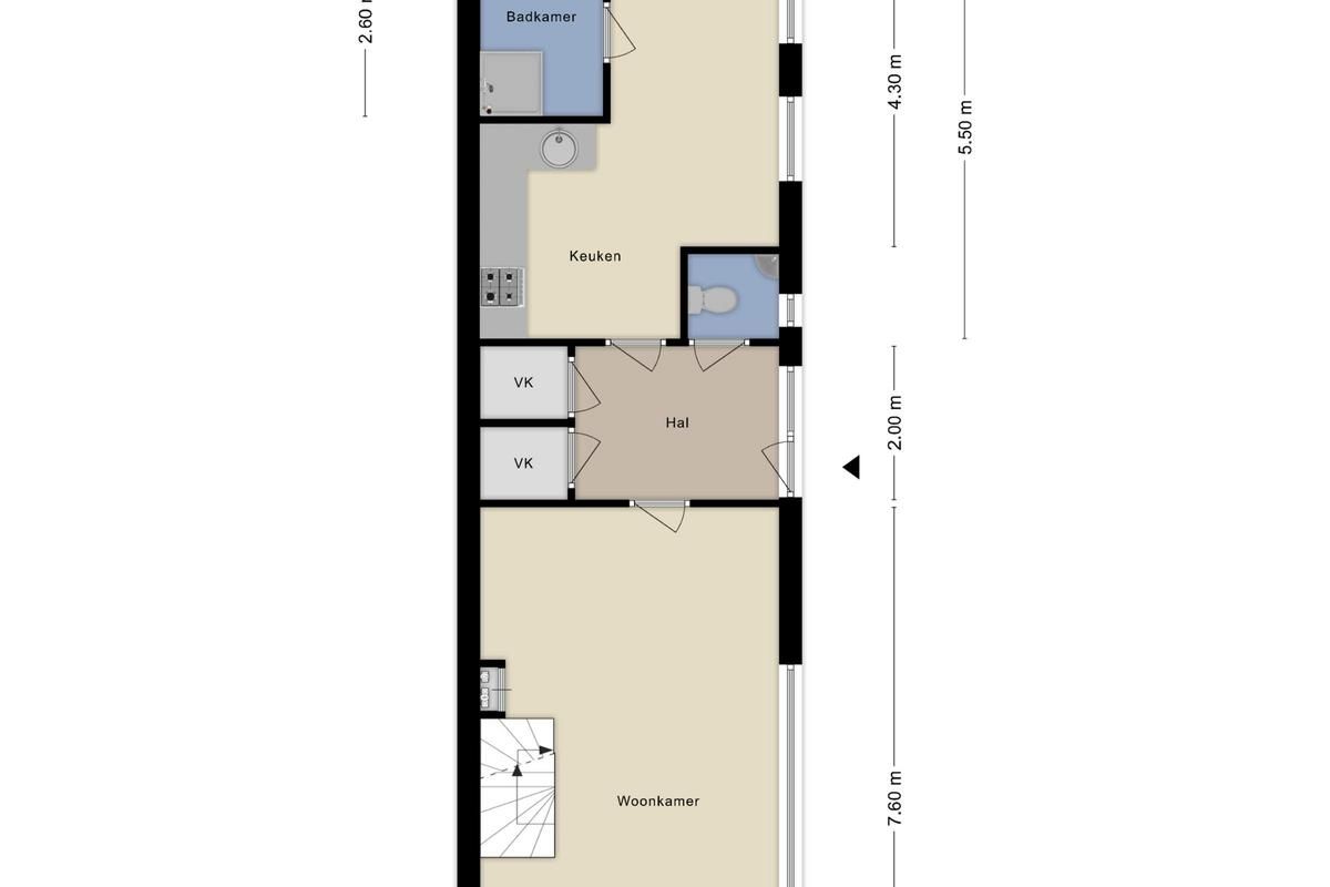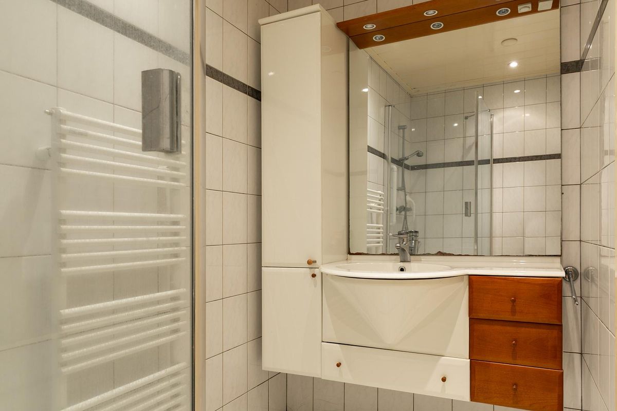 Aan de achterzijde van de woning treffen we de woonkeuken en de badkamer aan. De woonkeuken is van een dusdanig formaat dat ook hier voldoende ruimt eis voor een eettafel. De badkamerinrichting bestaat uit een douchecabine en een wastafel.