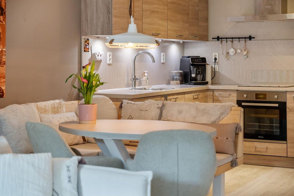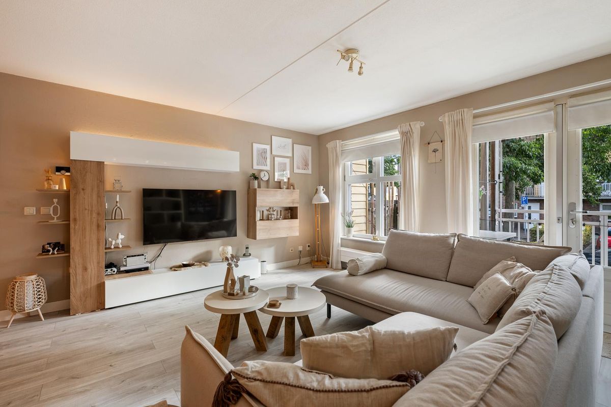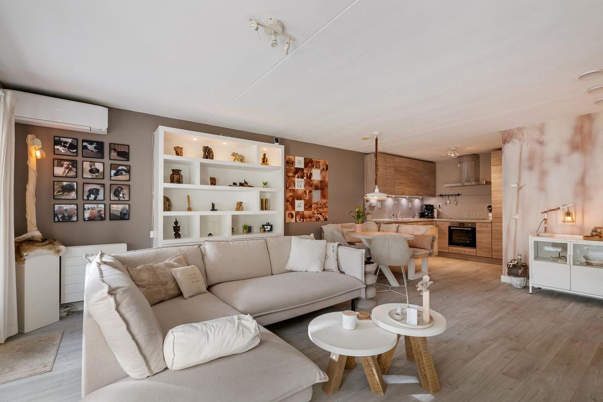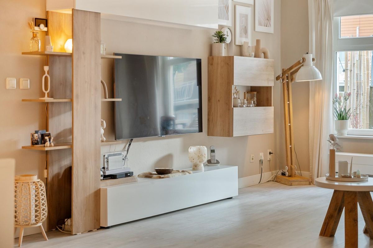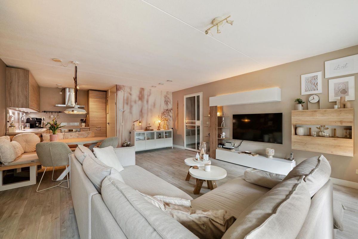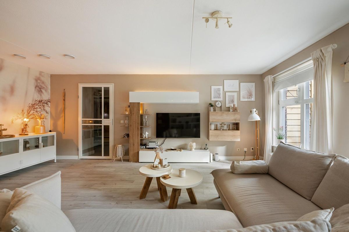 Je komt binnen in de hal, die toegang geeft tot alle vertrekken. De woonkamer is stijlvol ingericht in een moderne, Scandinavisch geïnspireerde stijl met lichte kleuren, natuurlijke materialen en een warme, rustige sfeer. De strakke lijnen worden gecombineerd met zachte tinten en houten accenten, wat zorgt voor een uitnodigende en tijdloze uitstraling.