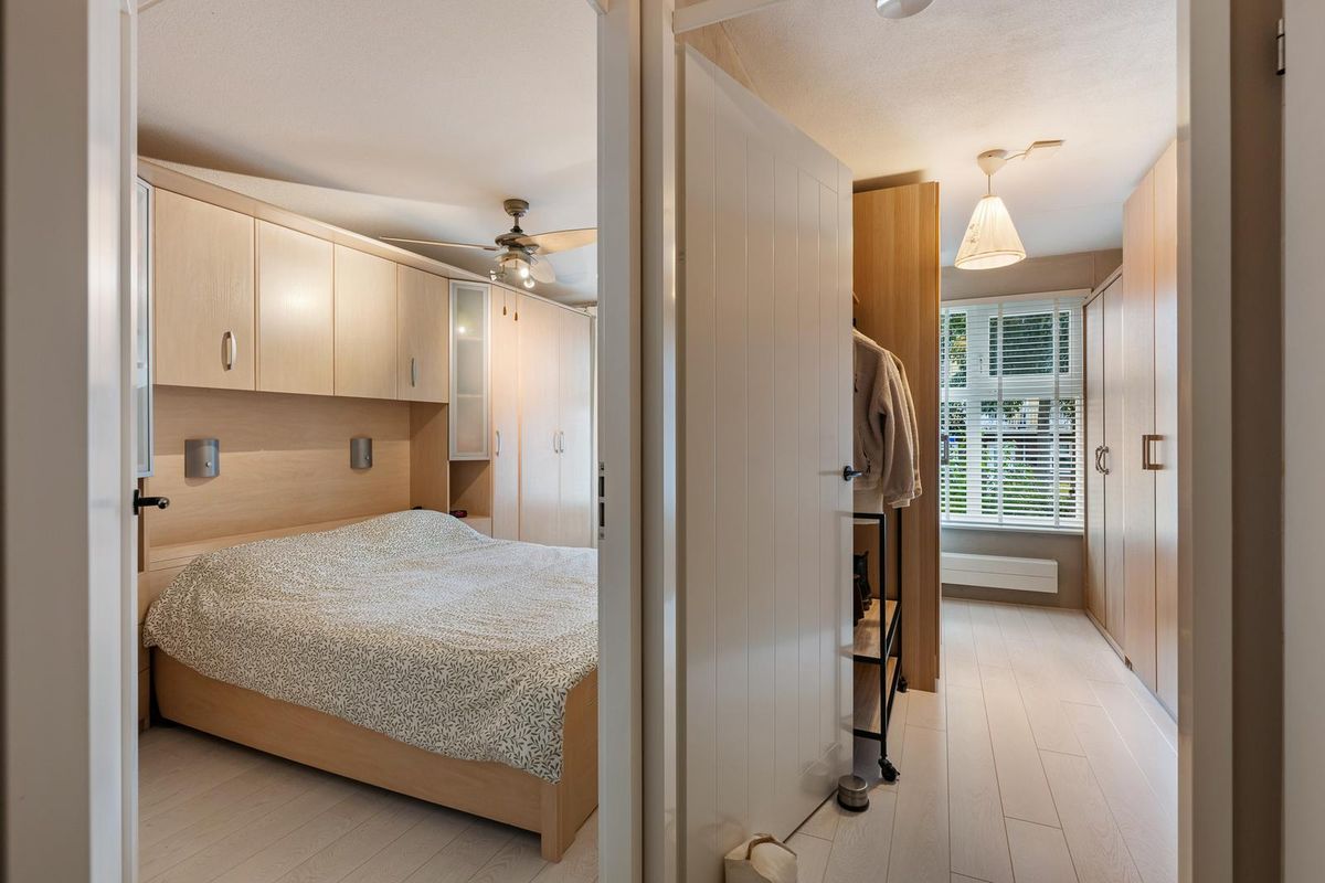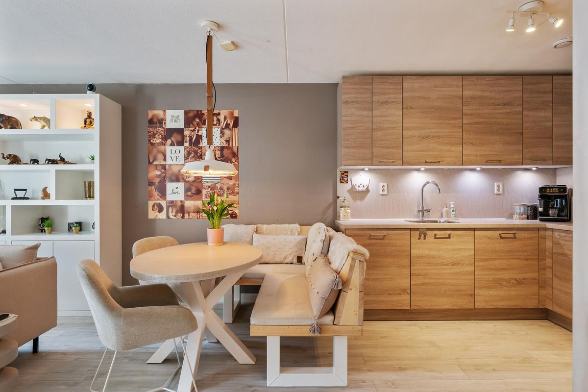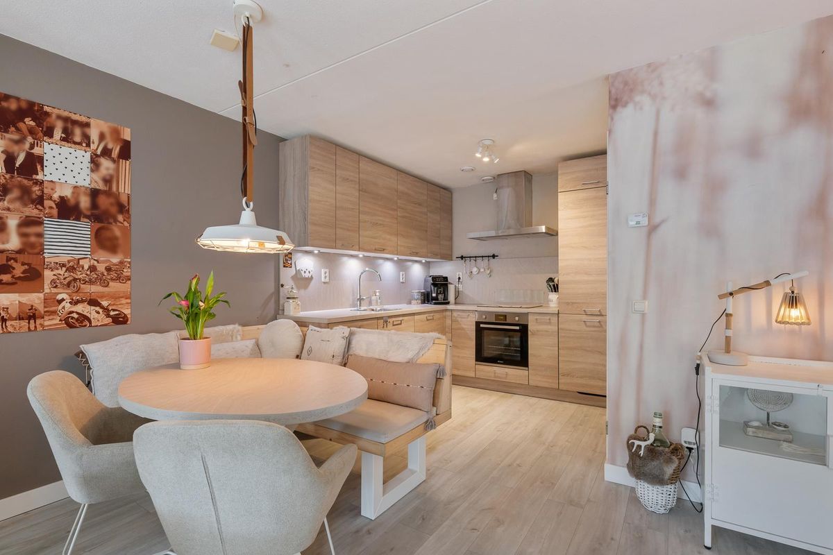 De open keuken sluit naadloos aan op de woonkamer en is van alle gemakken voorzien. Er is volop kastruimte, zowel boven als onder, en de inductiekookplaat is in 2024 nog vernieuwd. Aan de zijkant van de keuken bevindt zich een praktische bergkast met de CV-ketel, WTW-installatie (beide uit 2024) en de aansluiting voor de wasmachine.