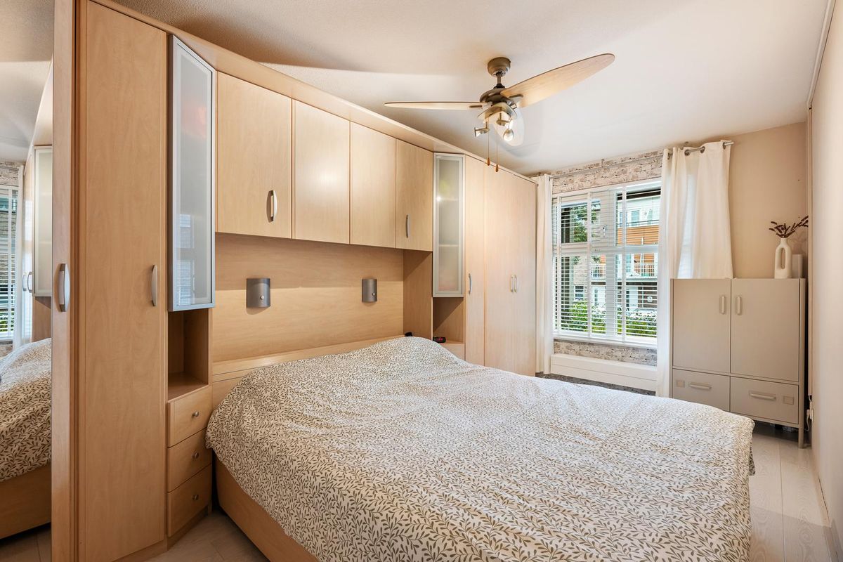 Vanuit de hal bereik je twee slaapkamers, waarvan één momenteel is ingericht als inloopkast. Deze ruimte leent zich uiteraard ook perfect als werkkamer, logeerkamer of babykamer. De badkamer is volledig in stijl met de rest van het appartement: modern en verzorgd, met grijze tegels, zwarte accenten, een inloopdouche, wastafelmeubel, handdoekenradiator en inbouwspots.