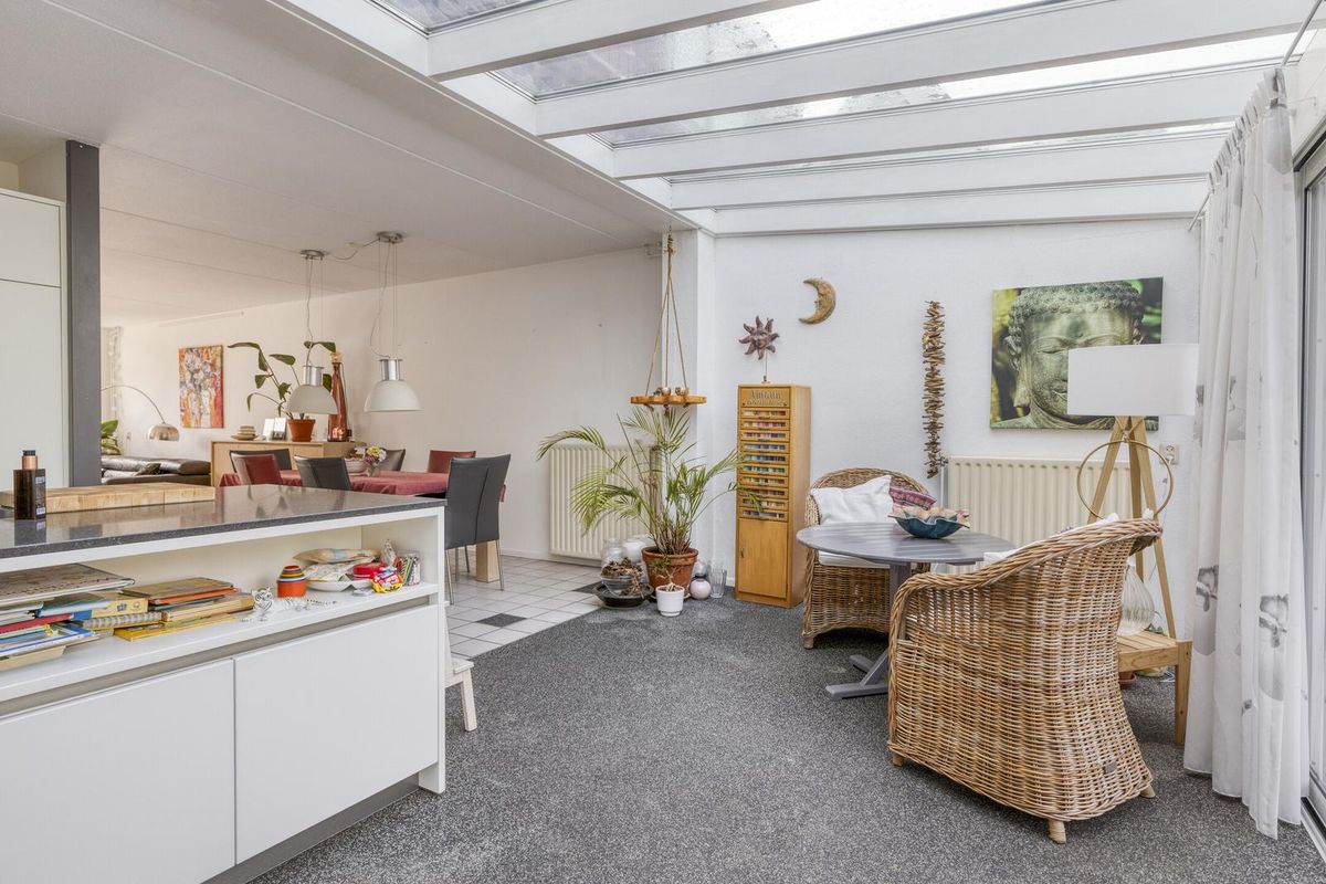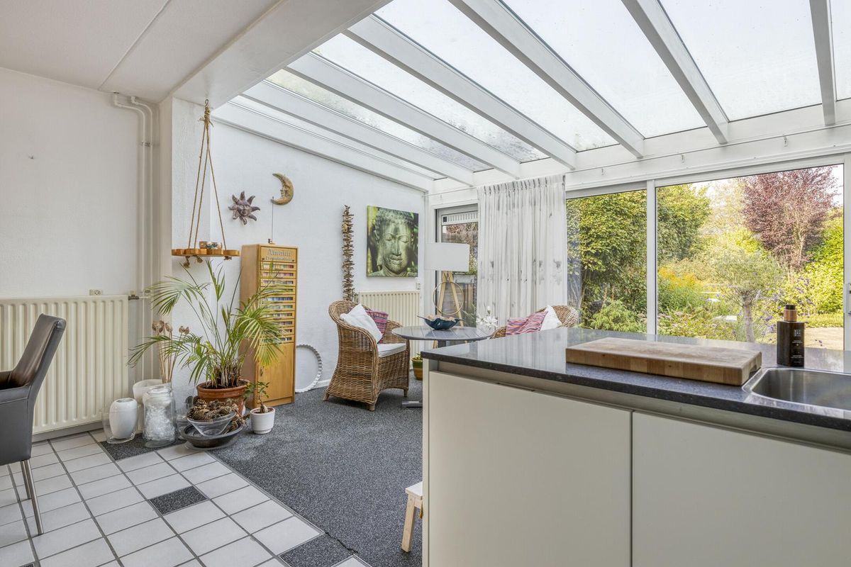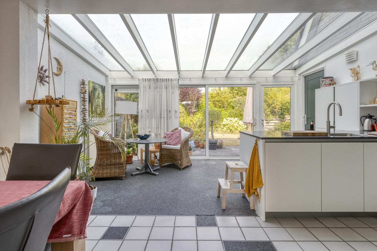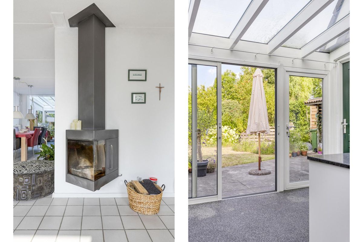 Via de hal met meterkast, toilet met fonteintje en trapopgang bereikt u de ruime L-vormige woonkamer. Aan de voorzijde zorgen grote raampartijen voor veel lichtinval, terwijl de houtkachel voor extra sfeer zorgt. Er is ruimte genoeg voor zowel een zithoek als een eethoek. De open keuken aan de achterzijde is uitgerust met een 5-pits inductiekookplaat, afzuiging, vaatwasser, oven, koelkast, magnetron en Quooker. Aansluitend bevindt zich de kunststof serre, voorzien van een schuifpui naar de achtertuin. Vanuit de keuken is er bovendien directe toegang tot de garage.
