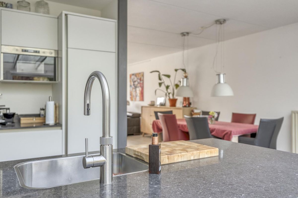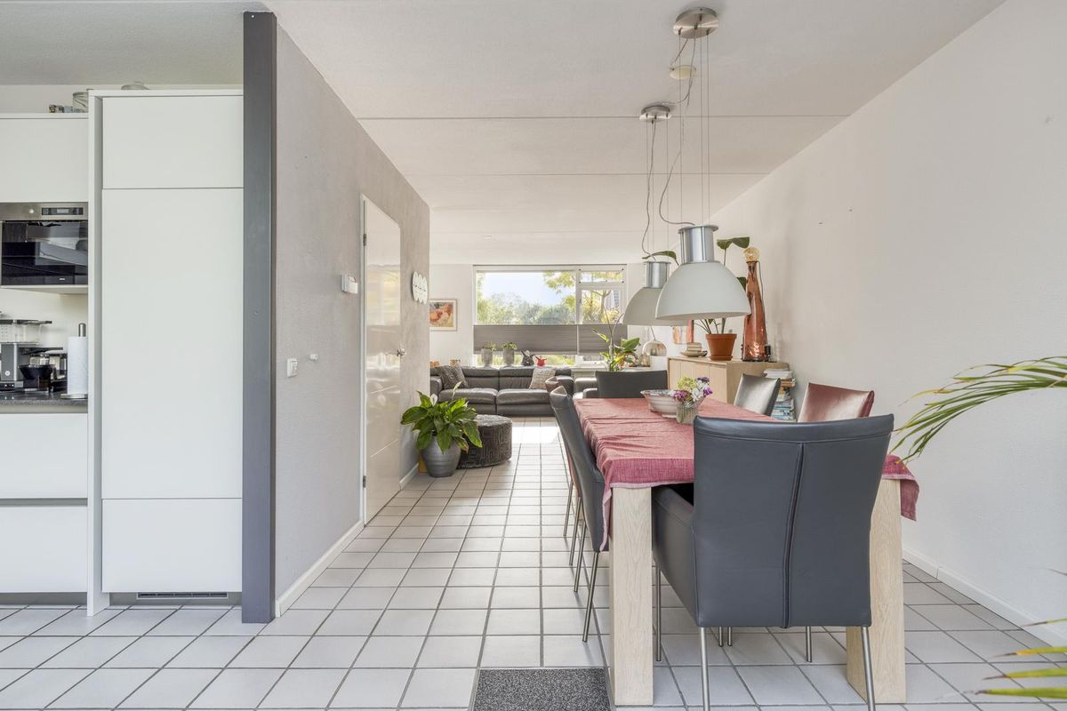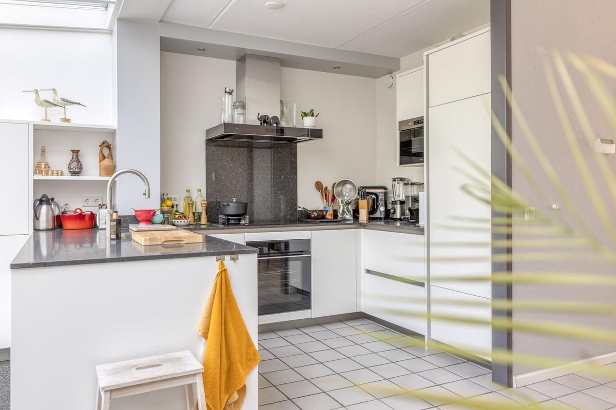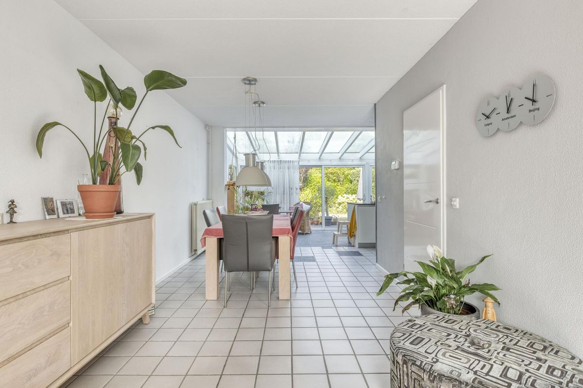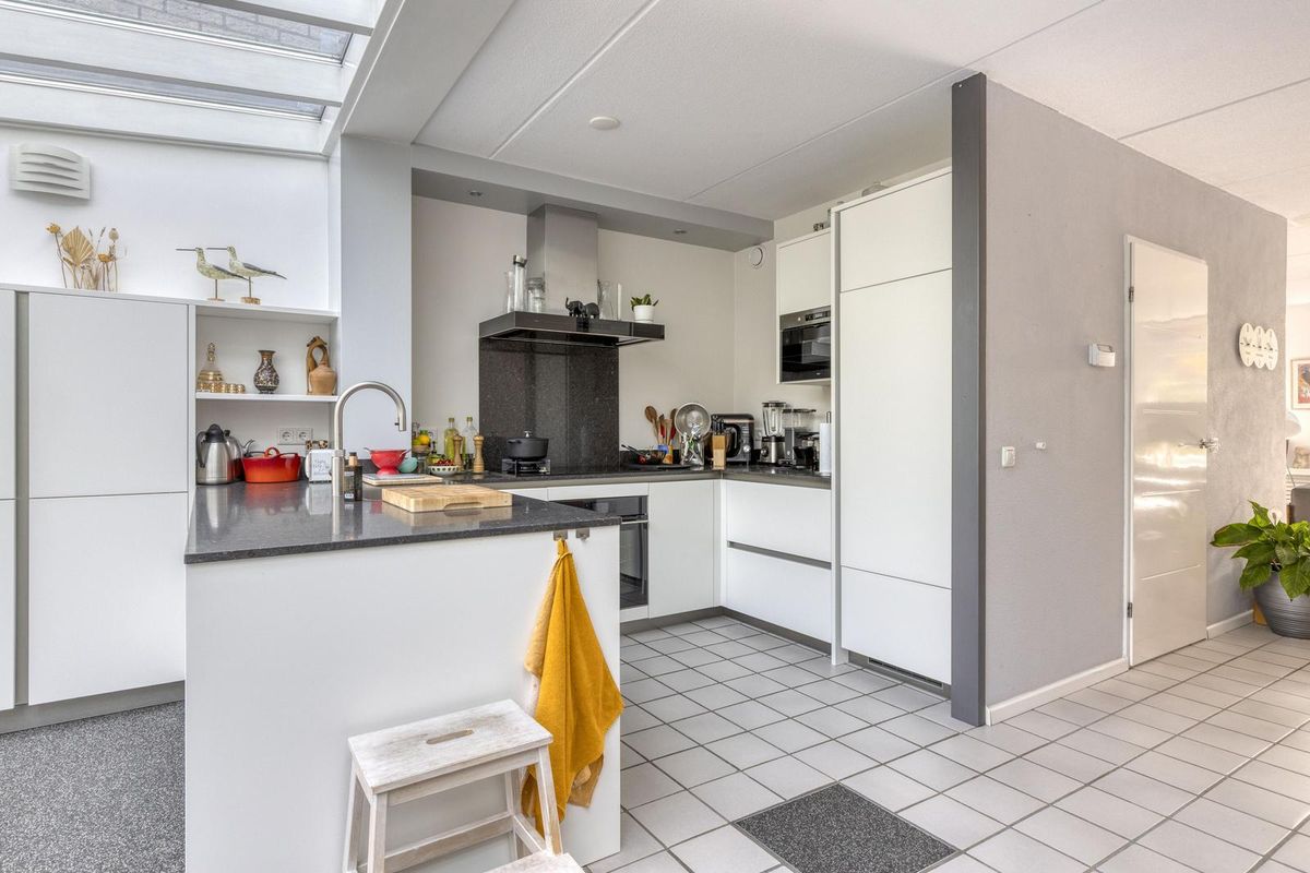 Via de hal met meterkast, toilet met fonteintje en trapopgang bereikt u de ruime L-vormige woonkamer. Aan de voorzijde zorgen grote raampartijen voor veel lichtinval, terwijl de houtkachel voor extra sfeer zorgt. Er is ruimte genoeg voor zowel een zithoek als een eethoek. De open keuken aan de achterzijde is uitgerust met een 5-pits inductiekookplaat, afzuiging, vaatwasser, oven, koelkast, magnetron en Quooker. Aansluitend bevindt zich de kunststof serre, voorzien van een schuifpui naar de achtertuin. Vanuit de keuken is er bovendien directe toegang tot de garage.