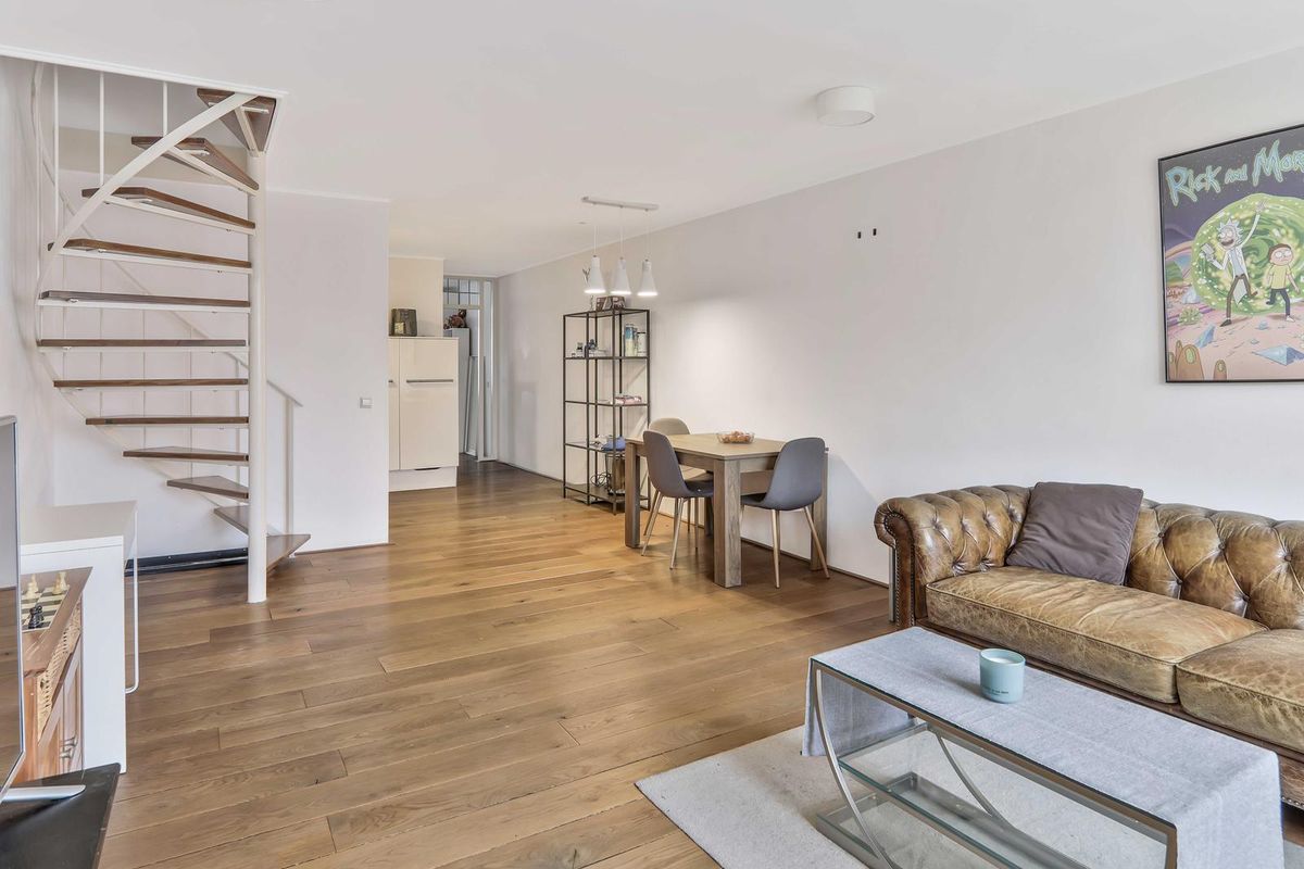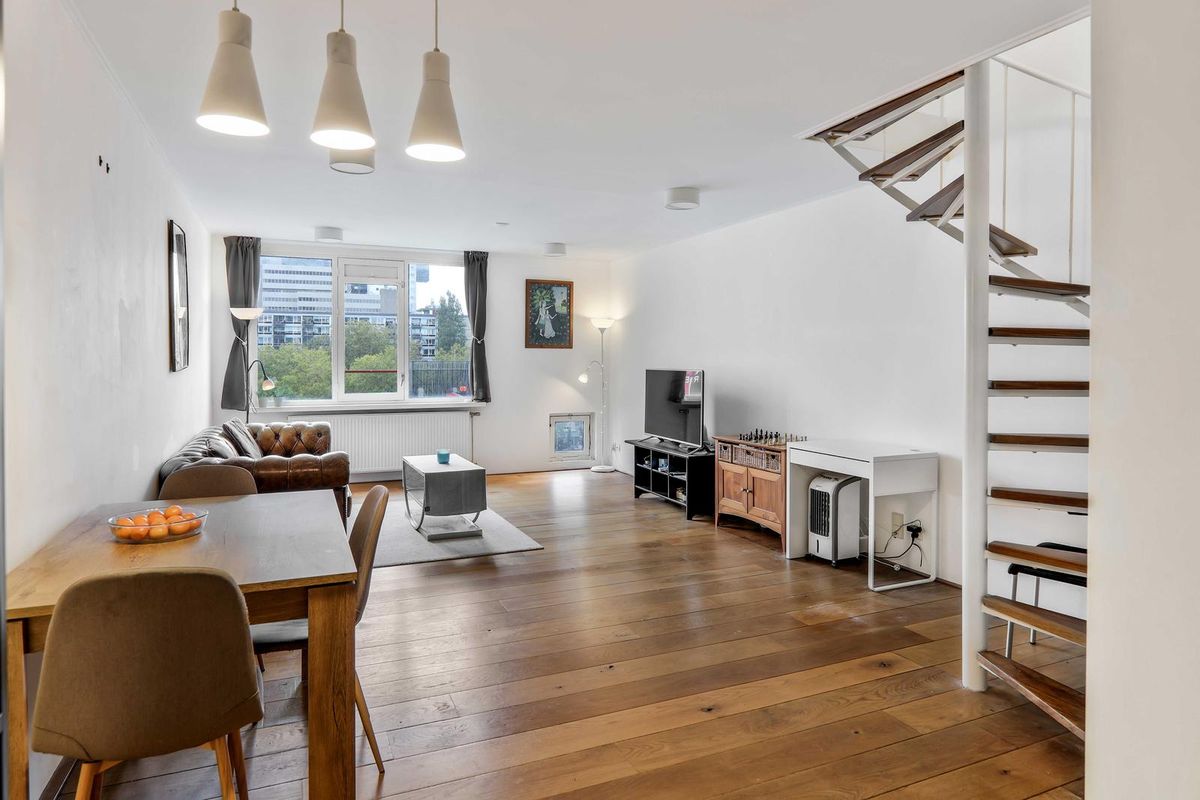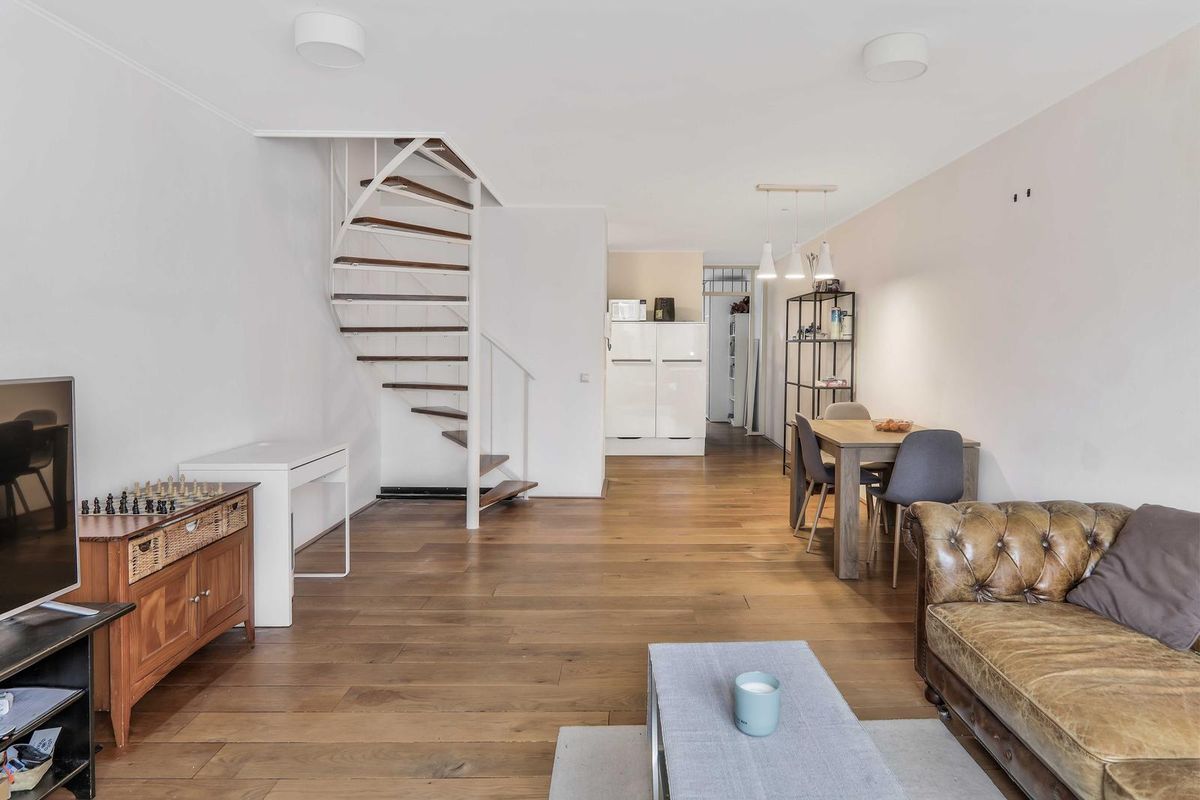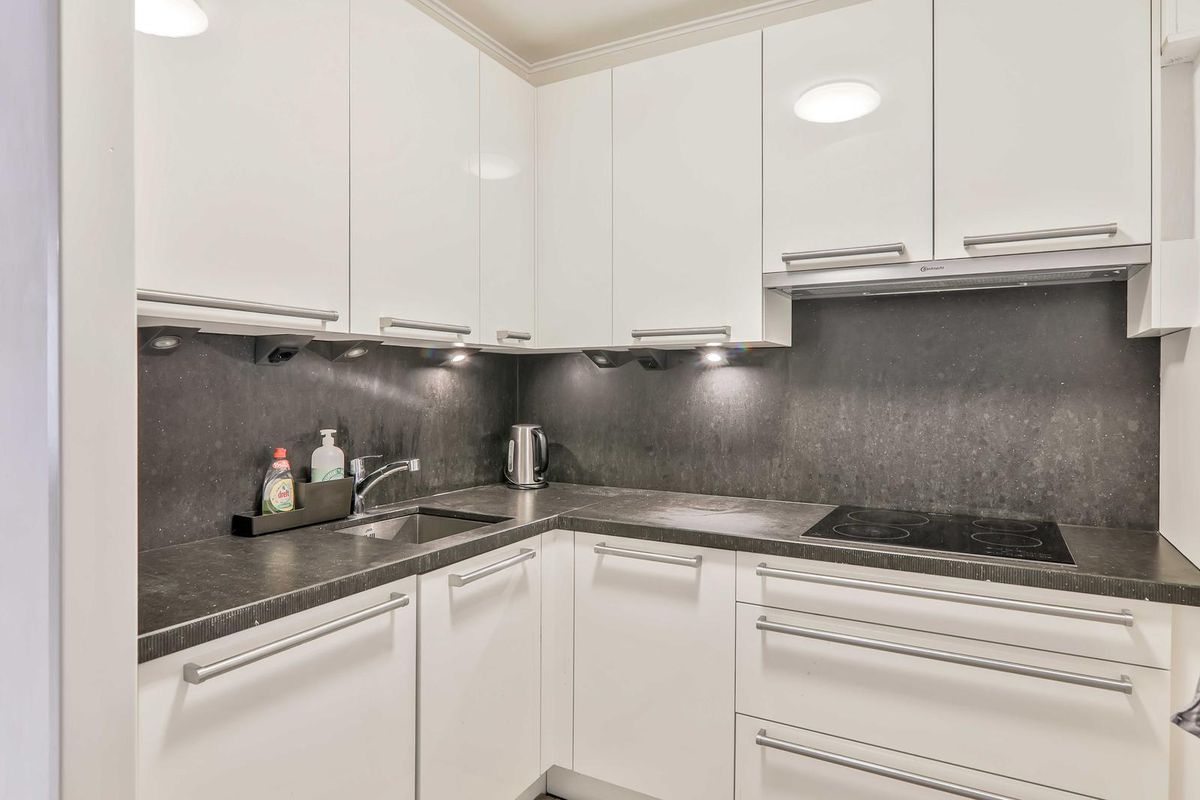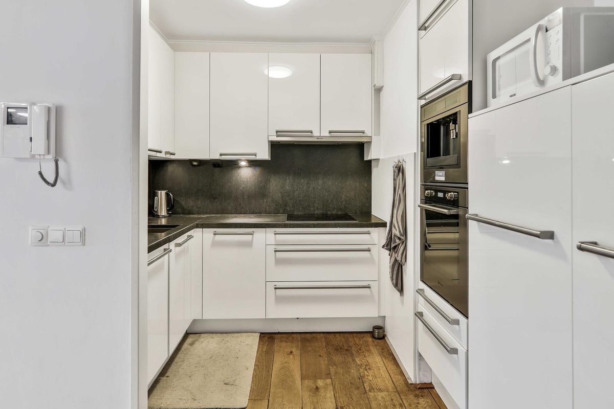 Via een interne trap kom je op de vijfde verdieping uit bij de lichte woonkamer met de halfopen keuken, de tweede slaapkamer met balkon en de badkamer met toilet. Dankzij de grote raampartijen valt er volop daglicht binnen, wat zorgt voor een aangename en open sfeer. De moderne keuken is voorzien van alle wenselijke inbouwapparatuur en biedt genoeg ruimte.