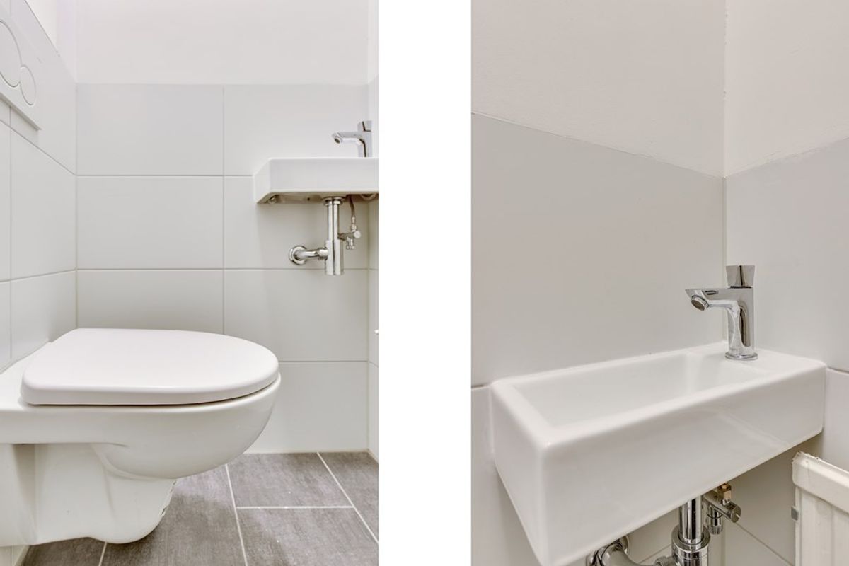 De geheel betegelde moderne badkamer is uitgerust met een inloopdouche, design radiator, en een vaste wastafel met meubel, opbergruimte en ligt aan de achterzijde van de woning. Tevens is de badkamer voorzien van een raam en een deur wat zorgt voor voldoende daglicht en natuurlijke ventilatie.