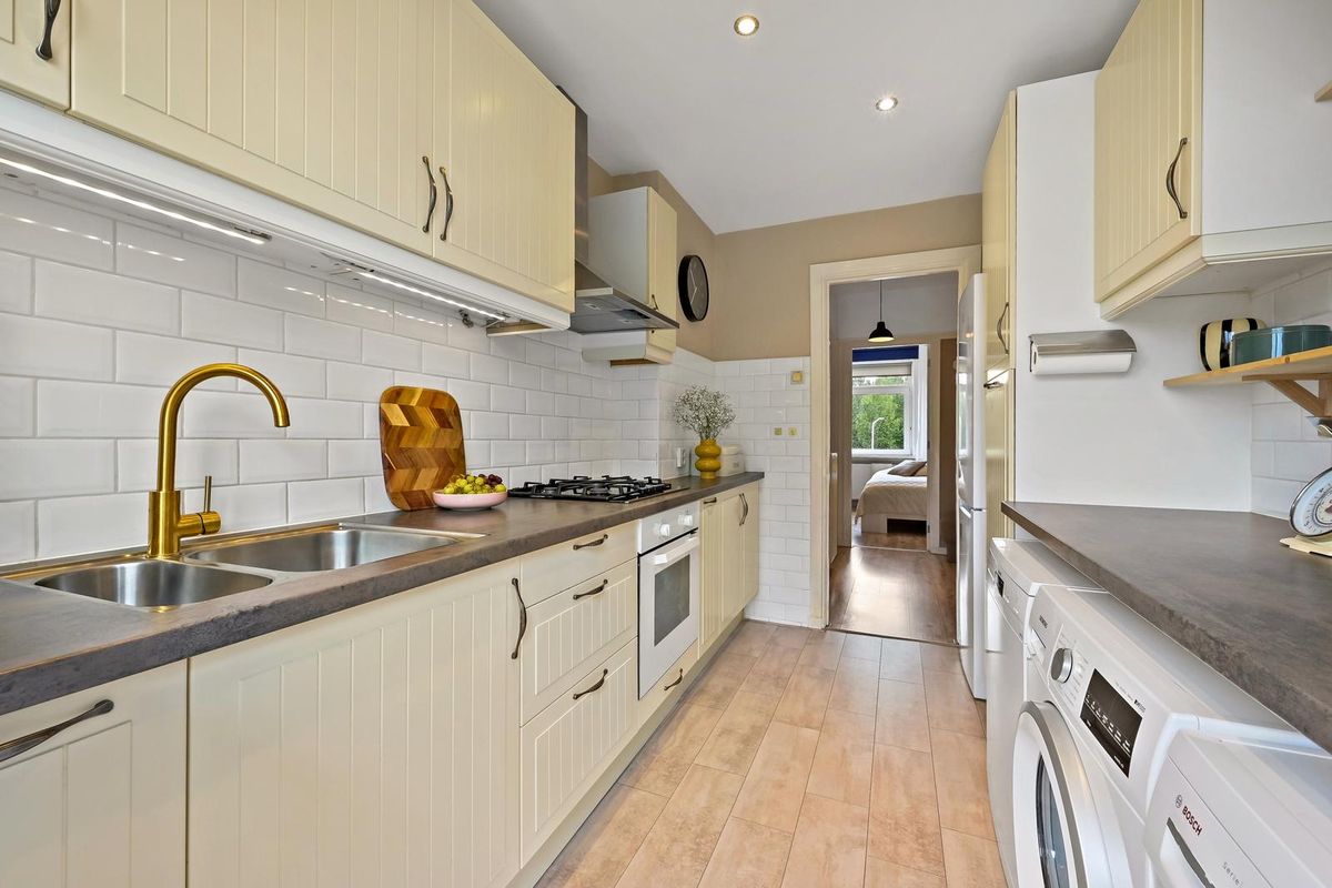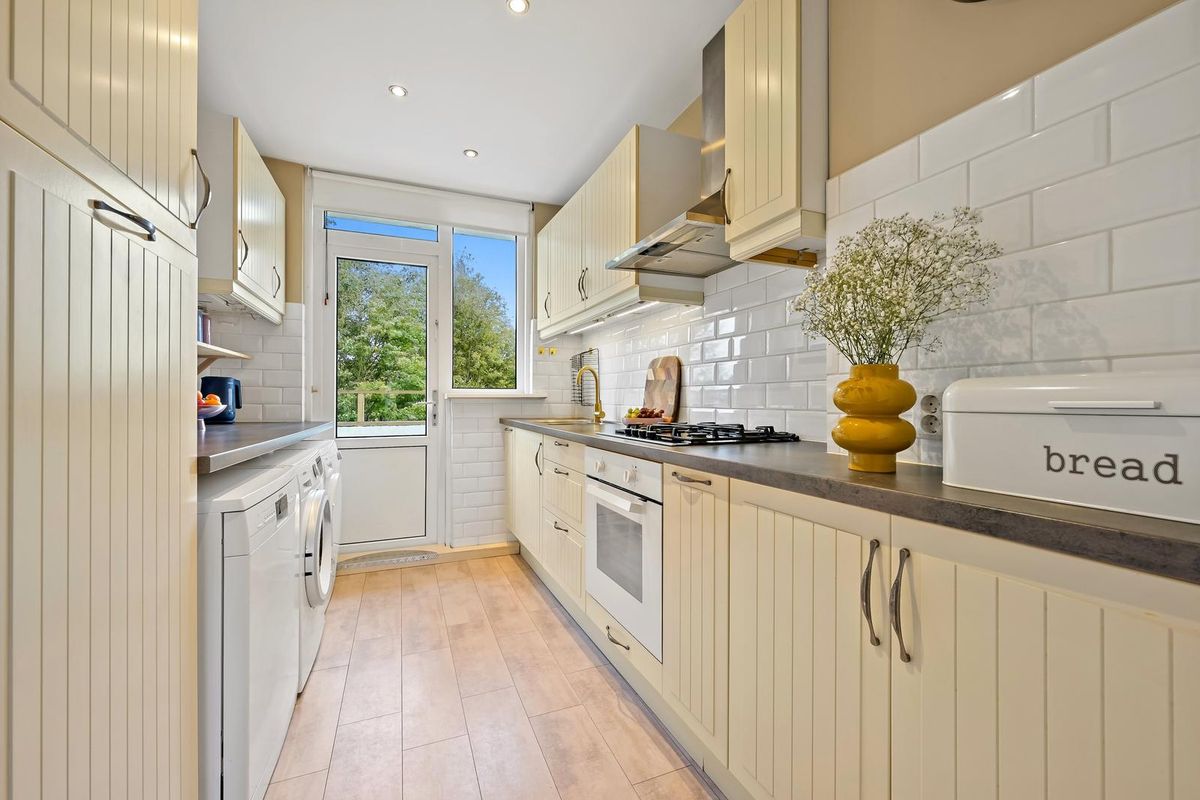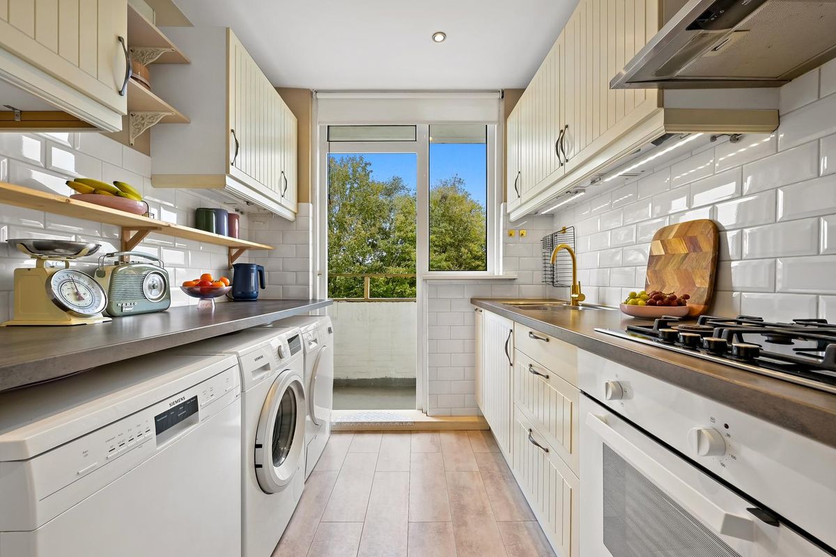 De keuken is modern, praktisch ingedeeld en geeft direct toegang tot het balkon. Hier start je je dag met een kop koffie in de zon of sluit je af met een drankje buiten na werk.