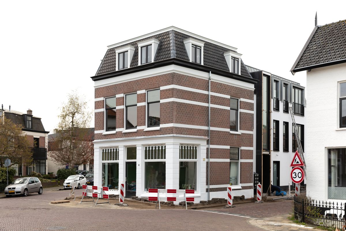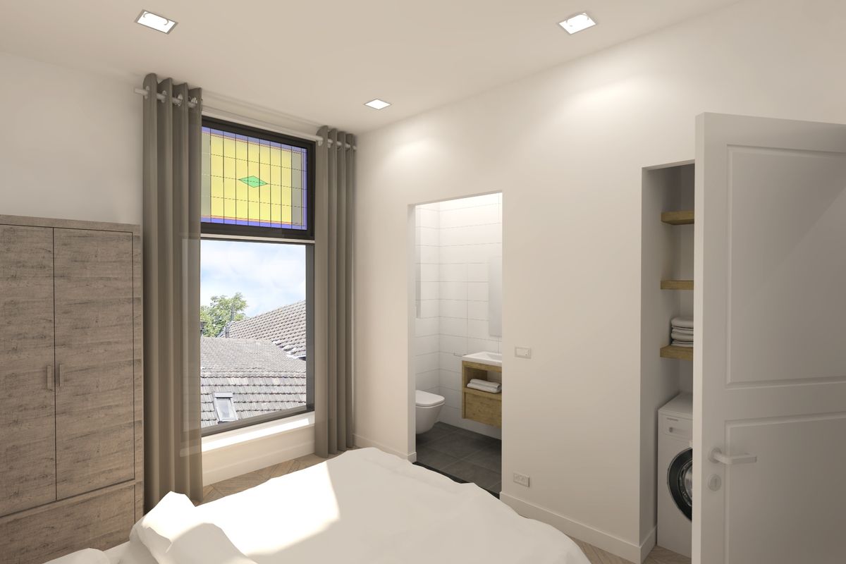 The entire apartment has a sleek herringbone floor and smooth plastered white painted walls. Through the hall there is access to the living room with open kitchen and a special view over the brinkje (5-point intersection), where the stained glass has been restored to its original condition.