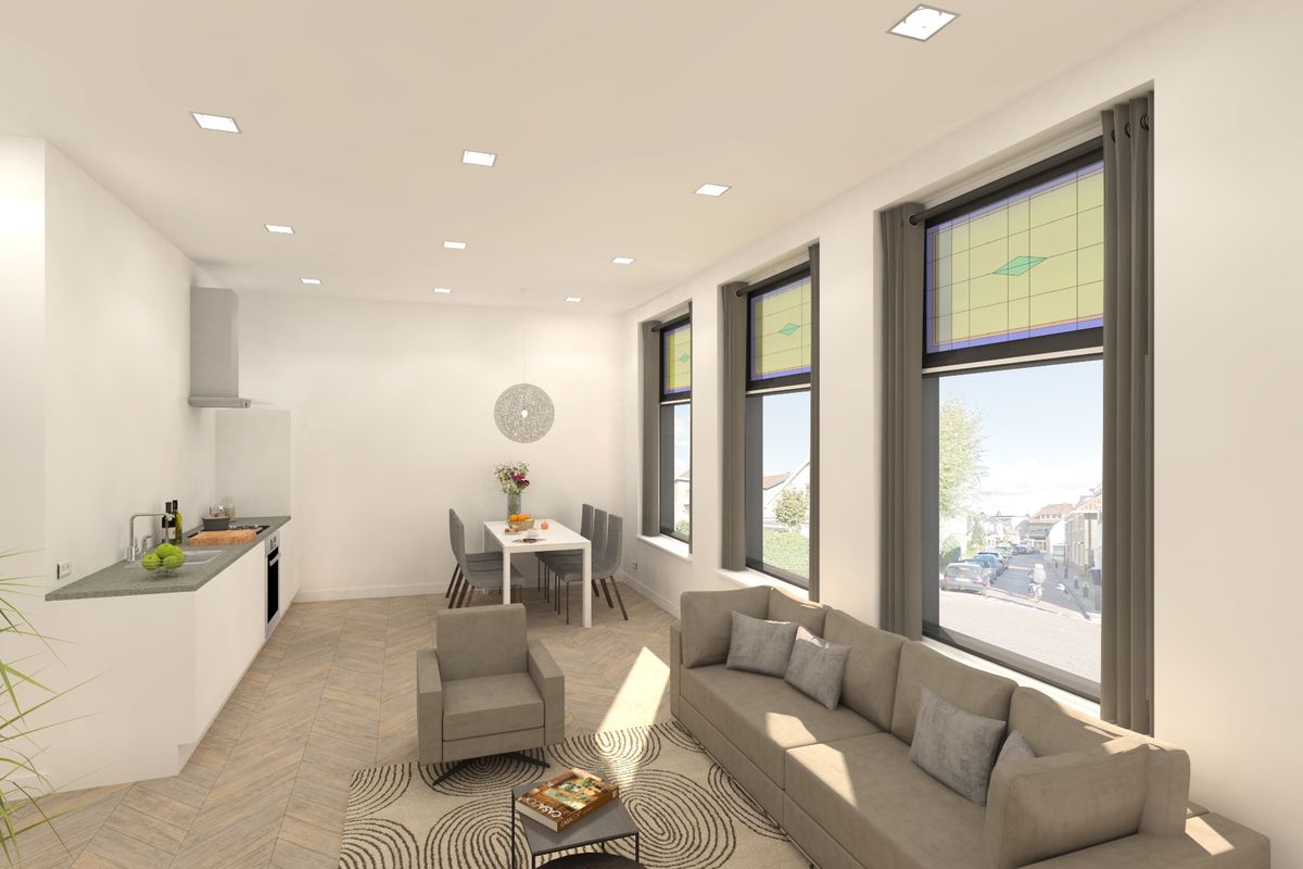 Het gehele appartement is voorzien van een strakke visgraat vloer en glad gestuukte wit gesausde wanden. Via de hal is toegang tot de living met open keuken en een bijzondere uitkijk over het brinkje (5-punts kruispunt), waarbij het glas in lood in originele staat is hersteld.