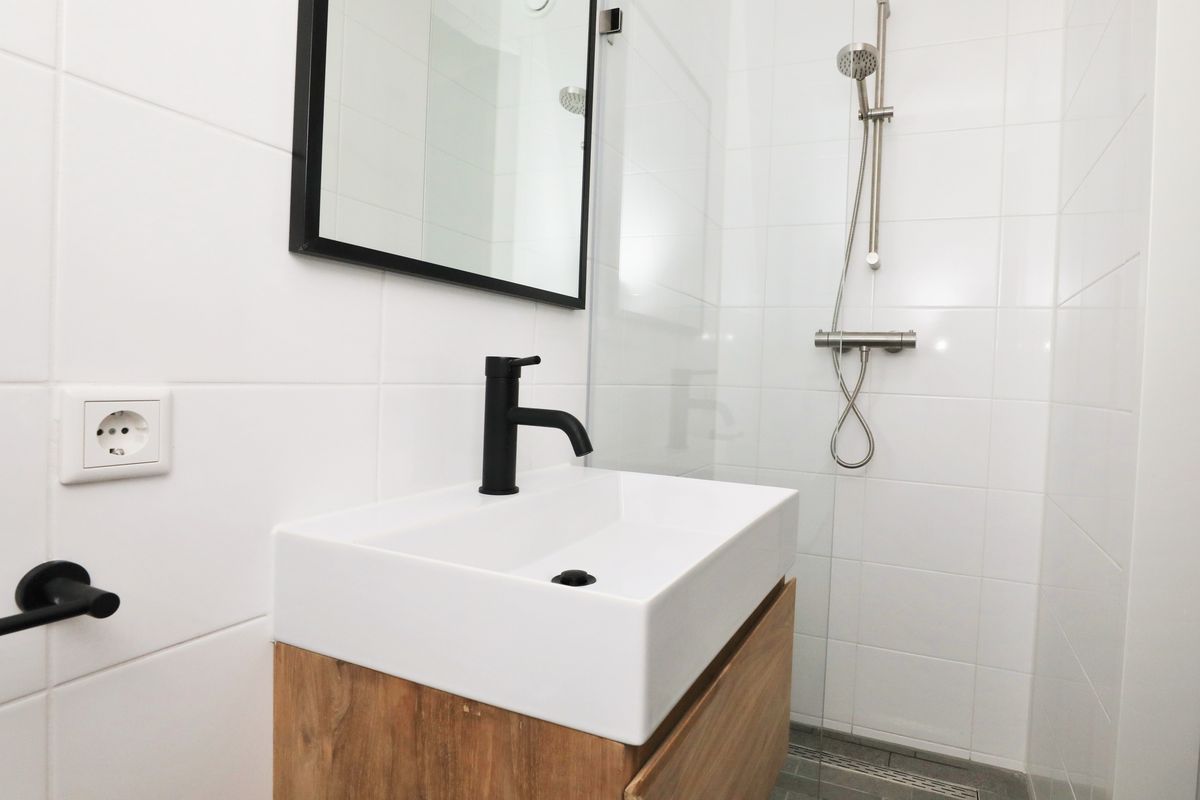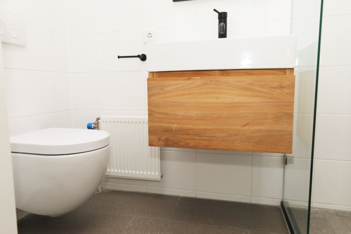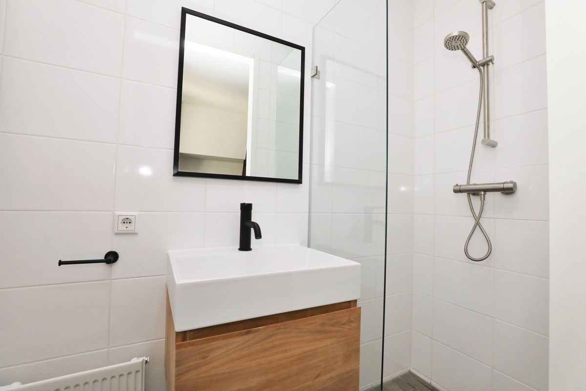 Via de hal is de slaapkamer te bereiken welke tevens toegang geeft tot de badkamer. De luxe uitgevoerde badkamer maakt het appartement compleet; luxe inloopdouche, mat zwart Meir douche set en kranen, een lichtgrijze vloertegel, hoogglans witte wandtegel tot aan het plafond, teakhouten spiegel, bijpassende teakhouten badkamer meubel met greeploze soft-close la en keramische wastafel.
