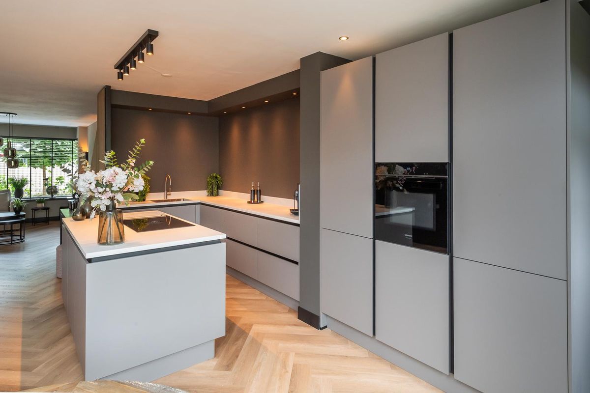 Entree met meterkast (vernieuwd in 2024) en toegang tot de woonkamer. Geheel betegelde toiletruimte met zwevend toilet en fonteintje. Royale living met open haard (gashaard), trapopgang (traprenovatie) naar de eerste verdieping en openslaande deuren naar de achtertuin. De woonkamer is afgewerkte met een visgraatvloer en gestuukte wandafwerking. Moderne en luxe open eiland keuken (2024) met fraaie composietbladen, veel opbergruimte en inbouwapparatuur waaronder een koelkast, vriezer, combi-oven (Siemens), vaatwasser, kookeiland met inductiekookplaat (Bora) met geïntrigeerde afzuiging en eveneens veel kastruimte. Strak afgewerkte wanden en -plafonds. De begane grond is voorzien van vloerverwarming. Elektrisch bedienbaar zonnescherm aan de voorzijde.