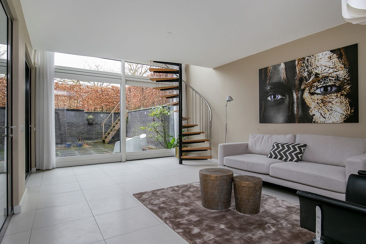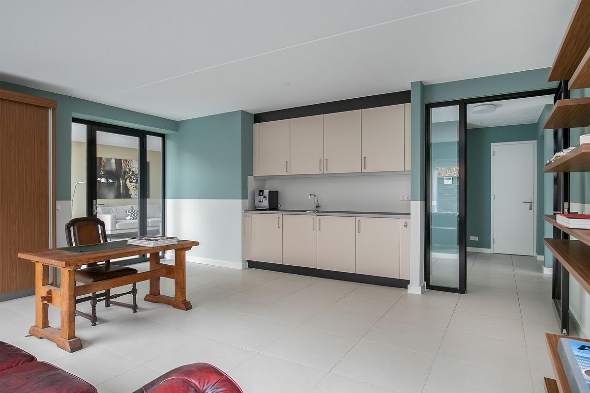 Op de eerste verdieping vindt u een toilet, berging, eetkamer en aansluitend de woonkamer en keuken. De ruime eetkamer heeft een sfeervolle doorkijkgashaard en een brede schuifpui naar een royaal dakterras van ca. 21 m². De luxe maatwerkkeuken is uitgevoerd in hoekopstelling met spoeleiland en provisiekast en voorzien van hoogwaardige inbouwapparatuur, waaronder een combi-oven, stoomoven, 5-pits gaskookplaat, vaatwasser, Amerikaanse koelkast en afzuigkap. De lichte woonkamer beschikt over hoge raampartijen, een vide en een spiltrap die in verbinding staat met de tuinkamer.