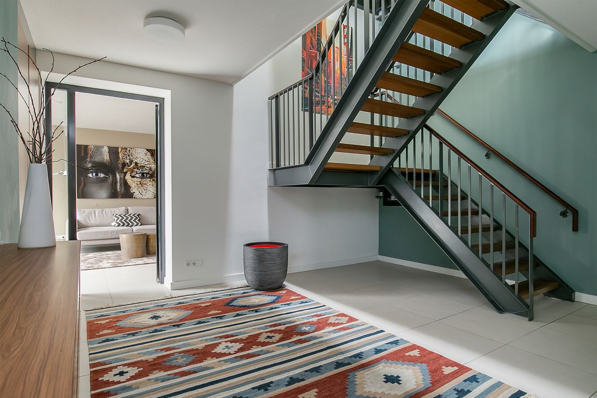 Via de overdekte entree bereikt u de ruime hal met inbouwkasten en toegang tot het toilet, de bijkeuken/berging, studeer-/werkkamer en tuinkamer. De moderne bordestrap vormt een echte eyecatcher en verbindt alle verdiepingen. De berging/bijkeuken is uitgerust met witgoedaansluitingen en heeft een directe toegang tot de straatzijde. De werkkamer beschikt over een pantry en schuifpui naar de patiotuin. Aansluitend vindt u de tuinkamer, eveneens met schuifpui naar de patio. Via een moderne spiltrap is de eerste verdieping bereikbaar.