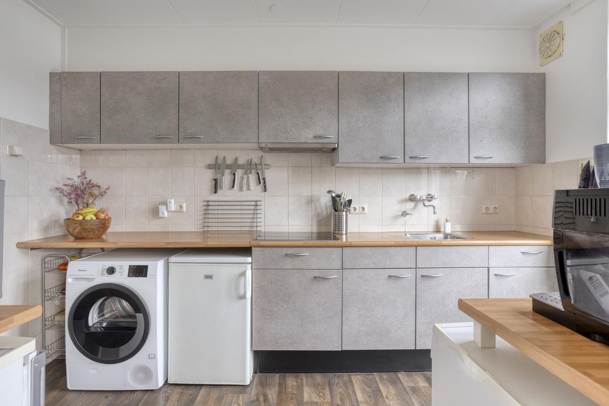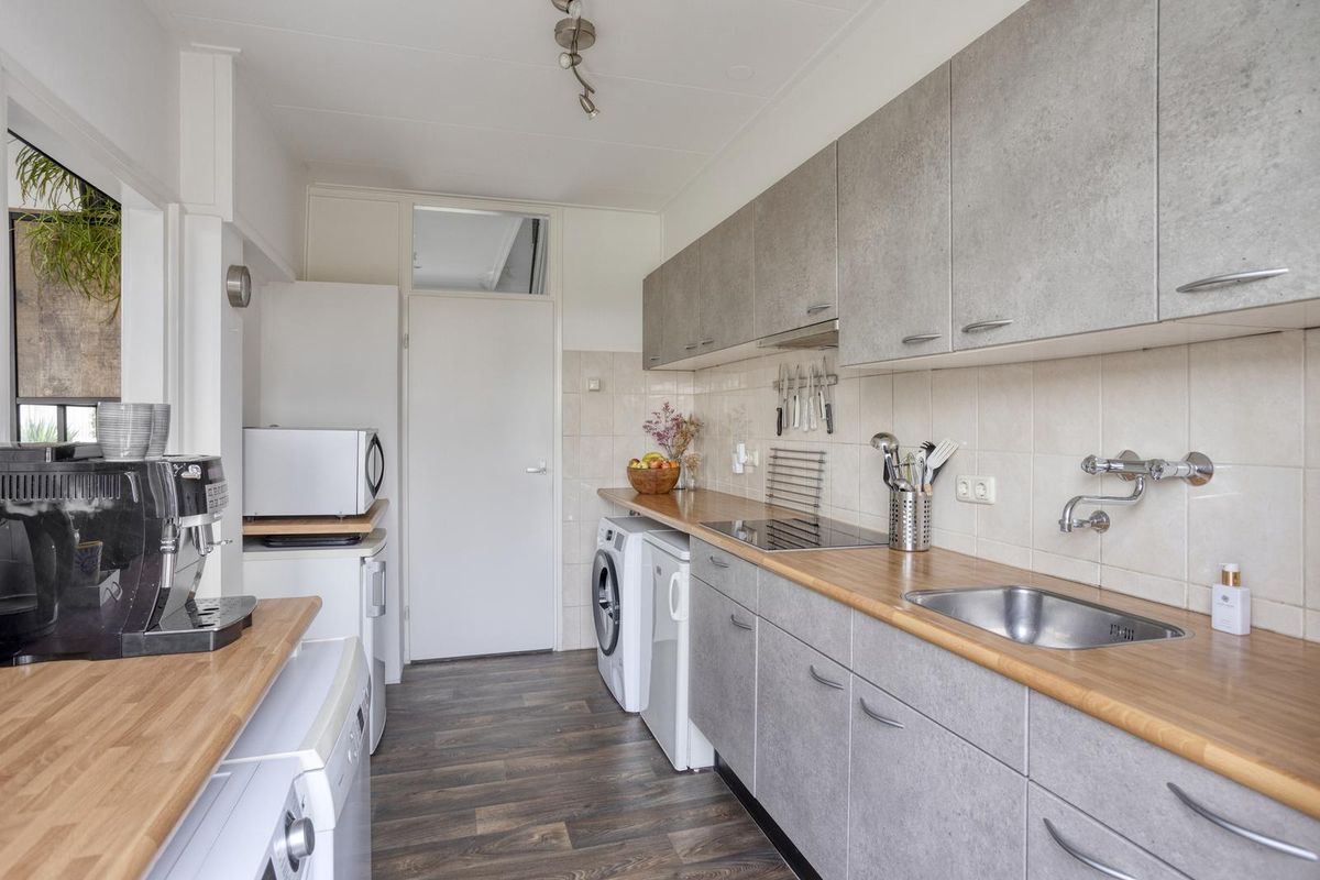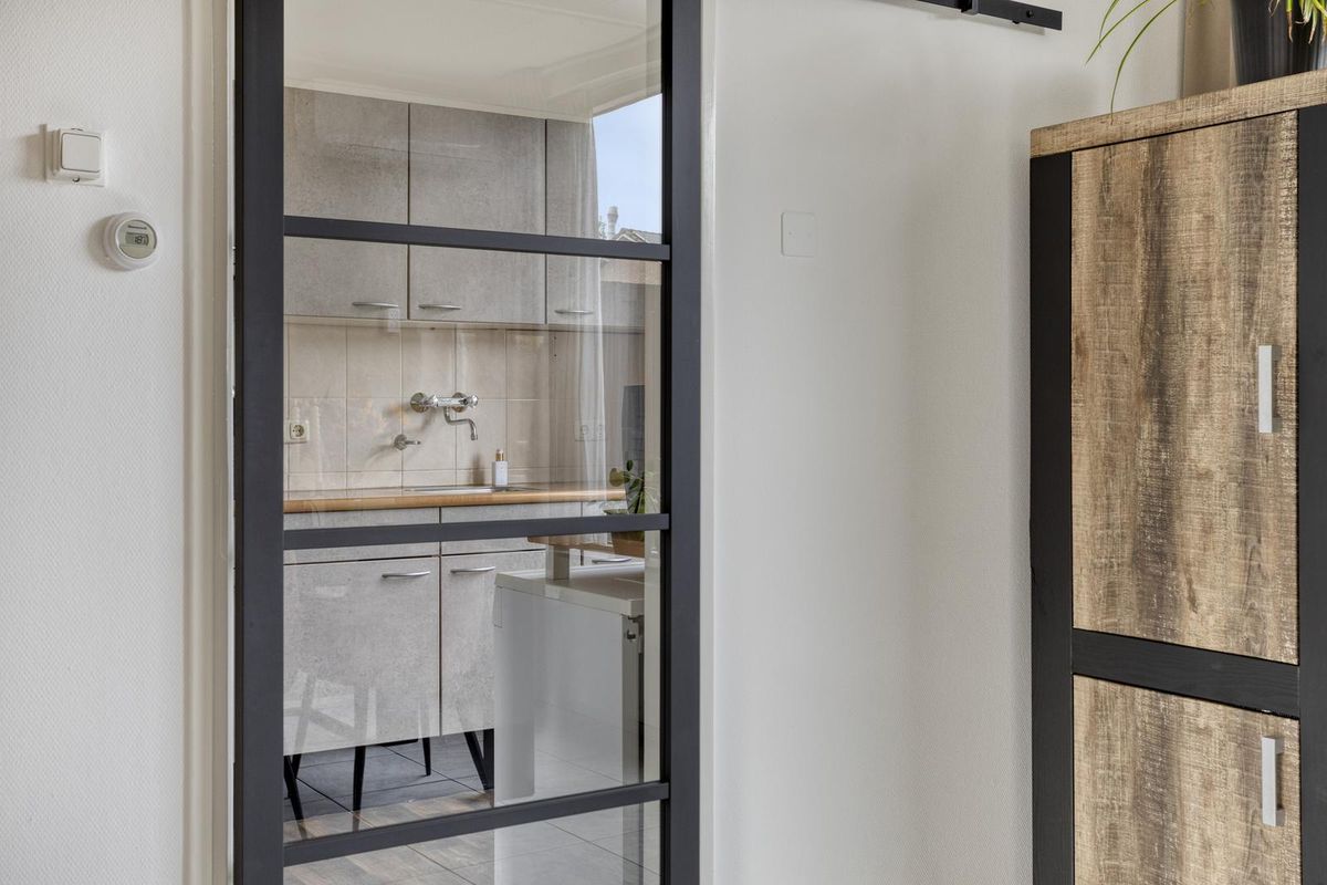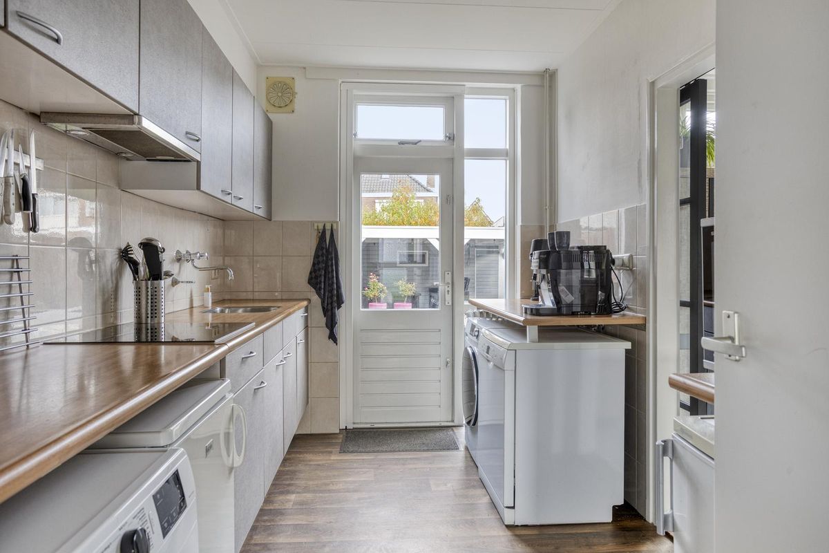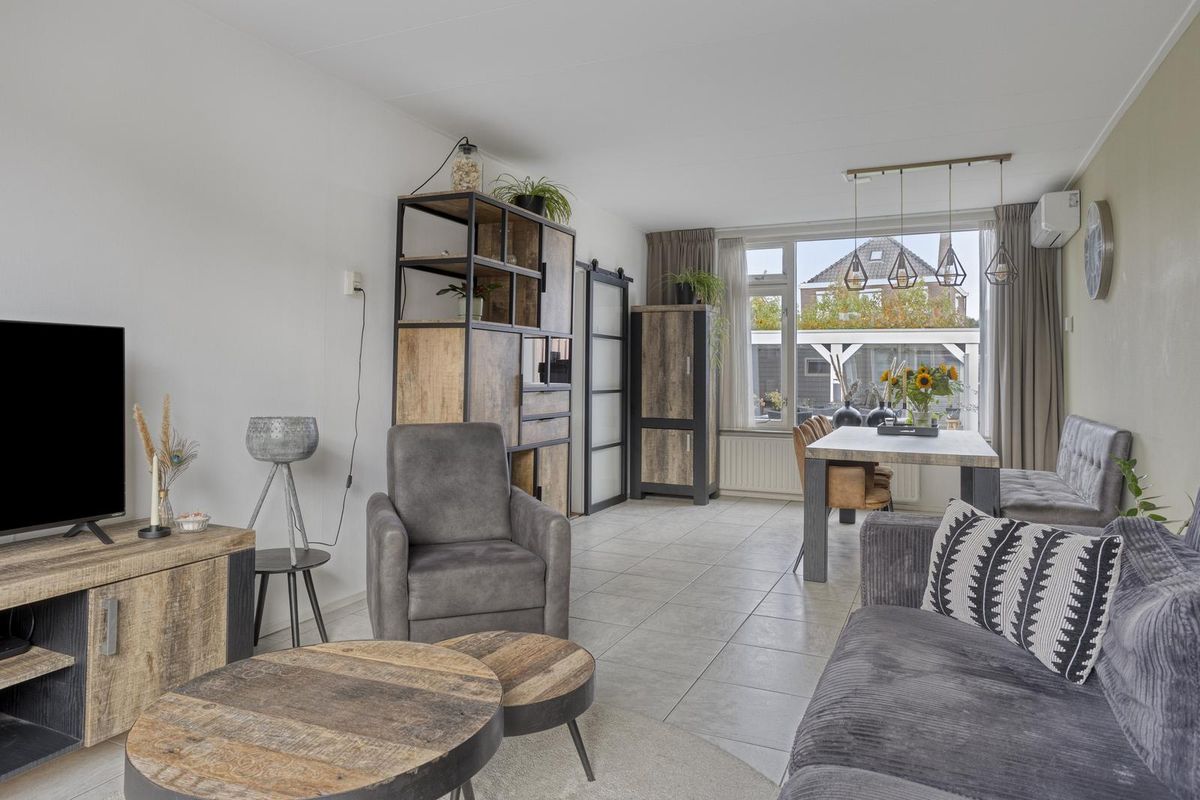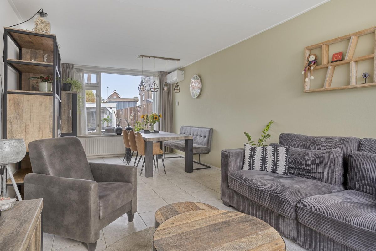 U komt binnen in de hal waar zich de meterkast, de garderobe, een toilet met fonteintje, de trapkast en de trapopgang naar de eerste verdieping bevinden. Deze hal geeft u toegang tot de keuken. De dichte keuken is voorzien van een 4-pits inductiekookplaat en een afzuigkap. De keuken biedt u toegang tot de verzorgde achtertuin en tot de gezellige woonkamer. De woonkamer heeft het zitgedeelte aan de voorzijde van de woning. Daarbij geniet de woonkamer veel lichtinval dankzij de royale raampartijen. De eethoek is aan de achterzijde van de woning gesitueerd. U kunt hier gemakkelijk een grote eettafel voor zes personen plaatsen. De woonkamer is voorzien van airconditioning.