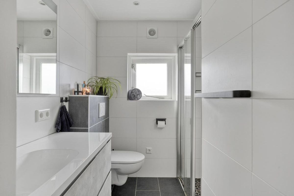 De eerste verdieping bestaat uit een overloop, drie lichte en fijne slaapkamers en een comfortabele badkamer. De beide grote slaapkamers aan zowel de achterzijde als aan de voorzijde van de woning zijn voorzien van airconditioning en beschikken over een praktische inbouwkast. De moderne badkamer is voorzien van een douche, een toilet en een wastafelmeubel. Een raam zorgt hier voor natuurlijke ventilatie.