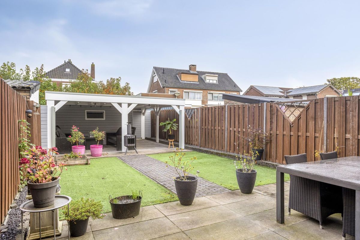De voortuin is verzorgd aangelegd met grind en bestrating. De verzorgde en besloten achtertuin is gelegen op het noorden en is bereikbaar via de keuken en via een achterom. De tuin is onderhoudsvriendelijk doch sfeervol aangelegd met een combinatie van bestrating en kunstgras. Tevens is de achtertuin voorzien van een praktische houten berging en een royale overkapping waar u heerlijk van uw tuin kunt genieten. De achtertuin is ook via een achterom te bereiken.