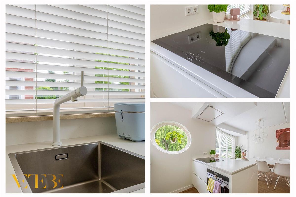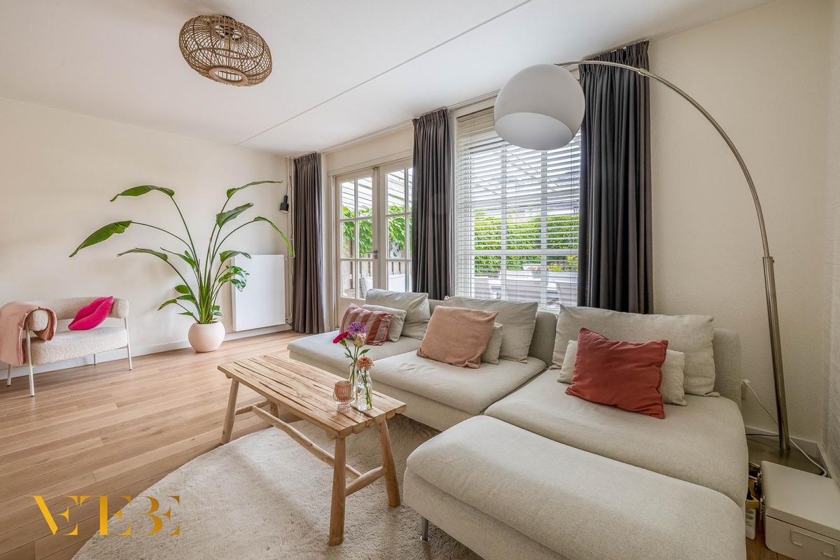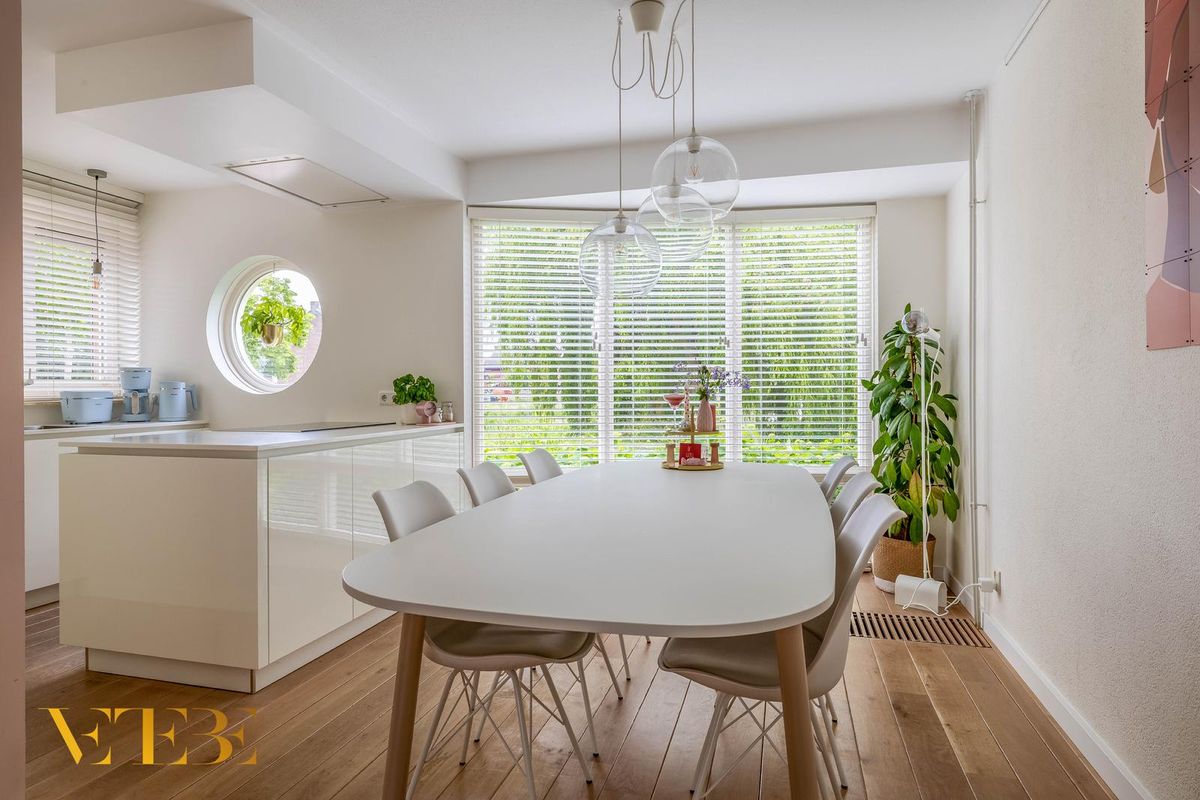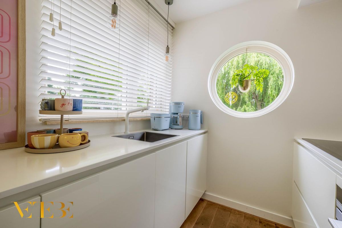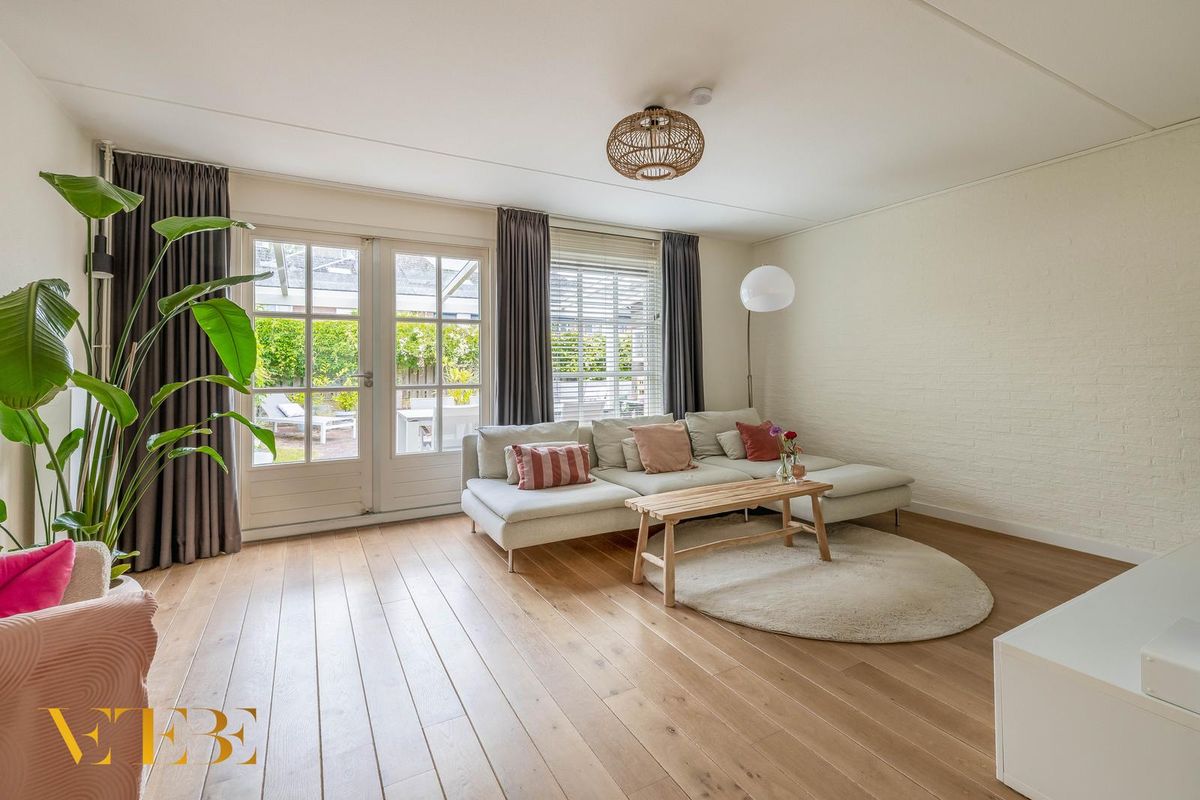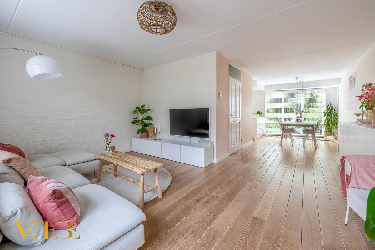 In de woonkamer (ca. 35m²) met open keuken (ca. 6m²) ligt een houten vloer. Aan de achterzijde bieden openslaande deuren toegang tot de tuin. Aan de voorzijde is er een mooi, vrij uitzicht op het aanwezige groen. De keuken is voorzien van een kookeiland met inductiekookplaat en afzuigkap, een koelkast, vaatwasser en combi oven/magnetron.