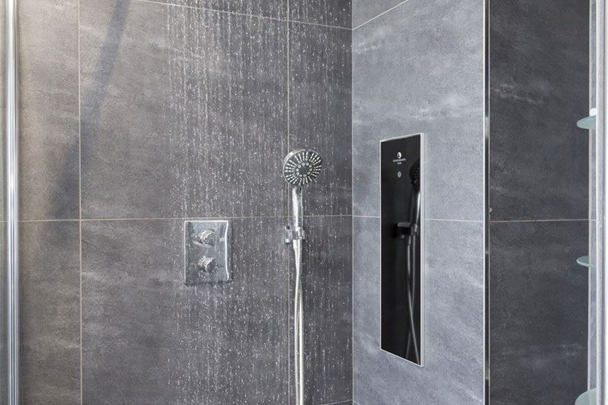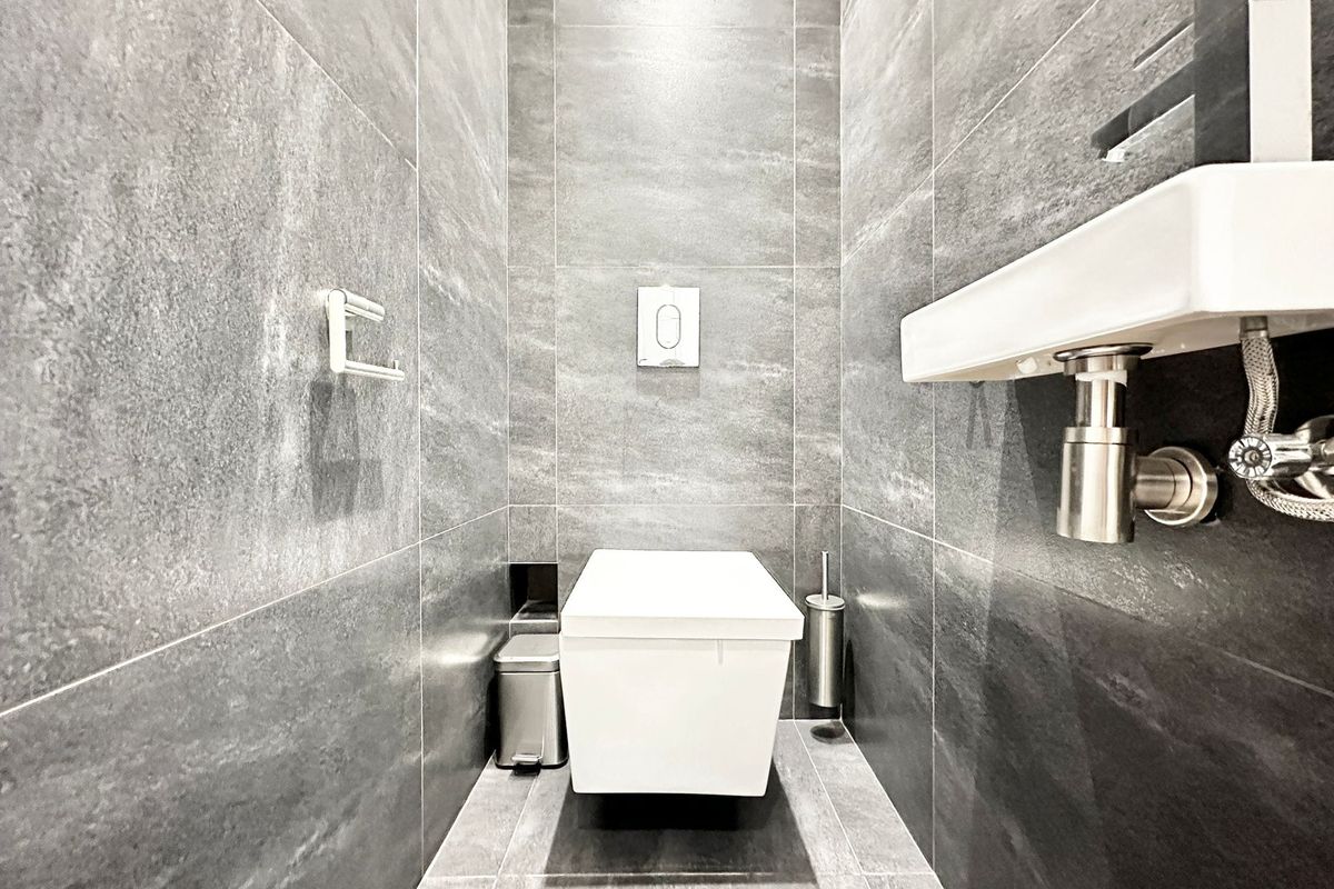 The luxurious bathroom invites you to unwind, with a generous bathtub, a walk-in rain shower, a double sink, and a toilet. There's also a separate guest toilet accessible from the hallway.