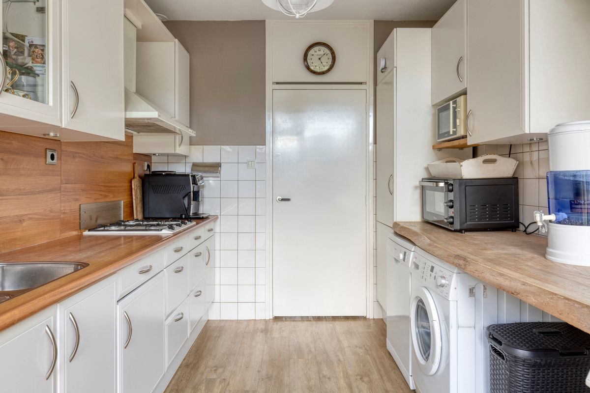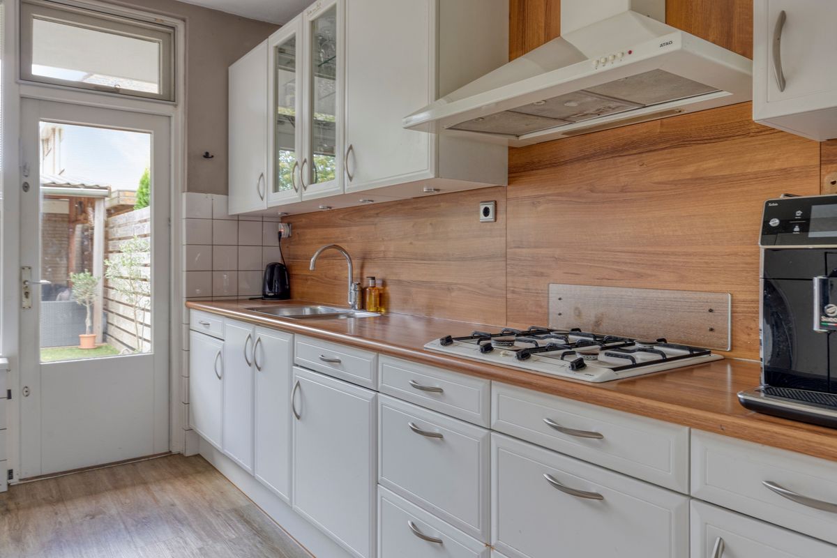 Keuken, een praktische en ruime keuken met een keukenblok in dubbel rechte opstelling. De keuken is voorzien van een gaskookplaat met afzuigkap, dubbele spoelbak, koel-vriescombinatie en een wasmachine- en drogeraansluiting. De keuken biedt daarnaast toegang tot de achtertuin.