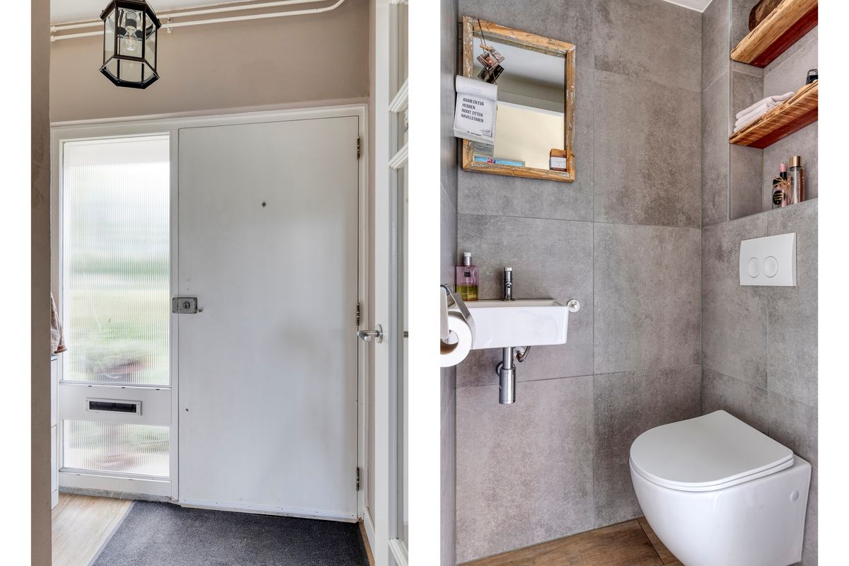 Toilet, vernieuwd in 2019, geheel betegeld en voorzien van een hangend closet en een fonteintje.