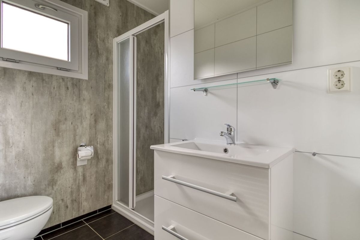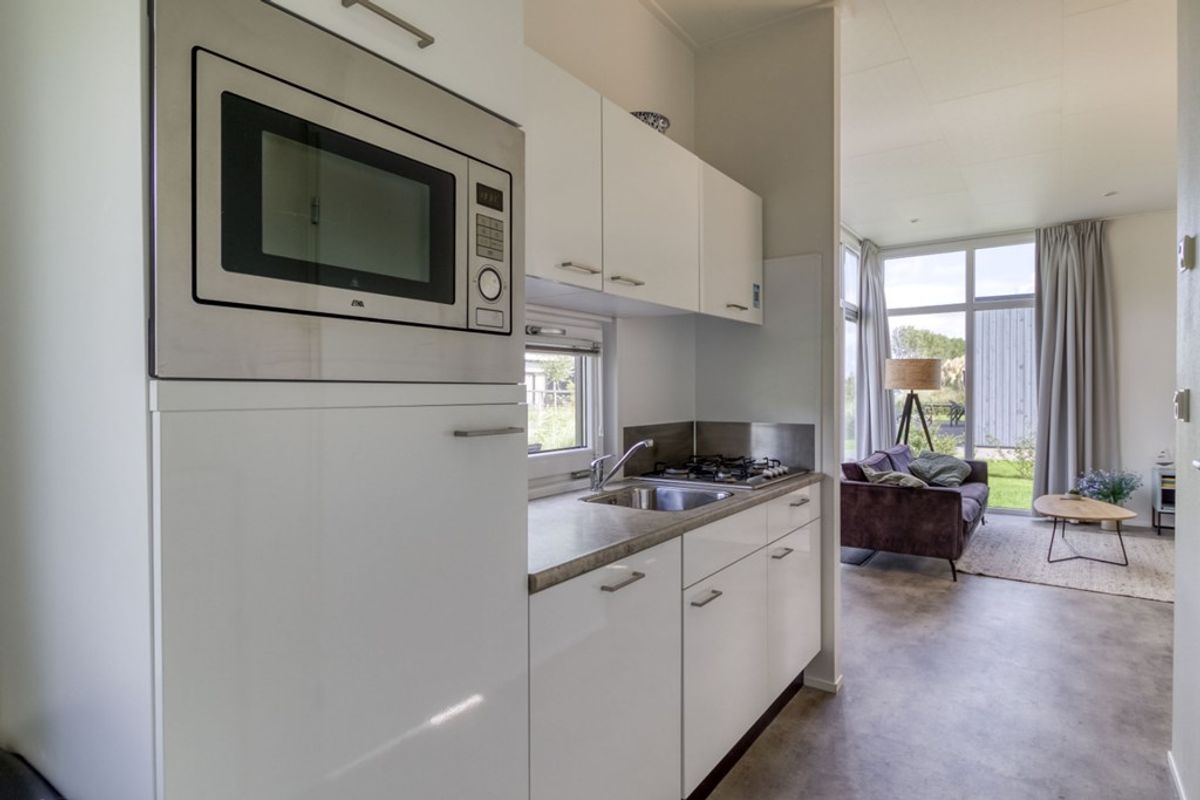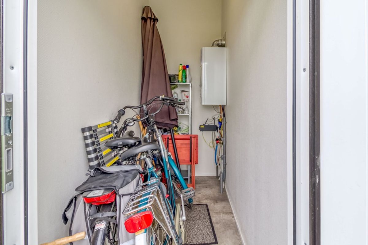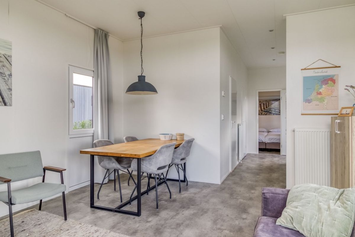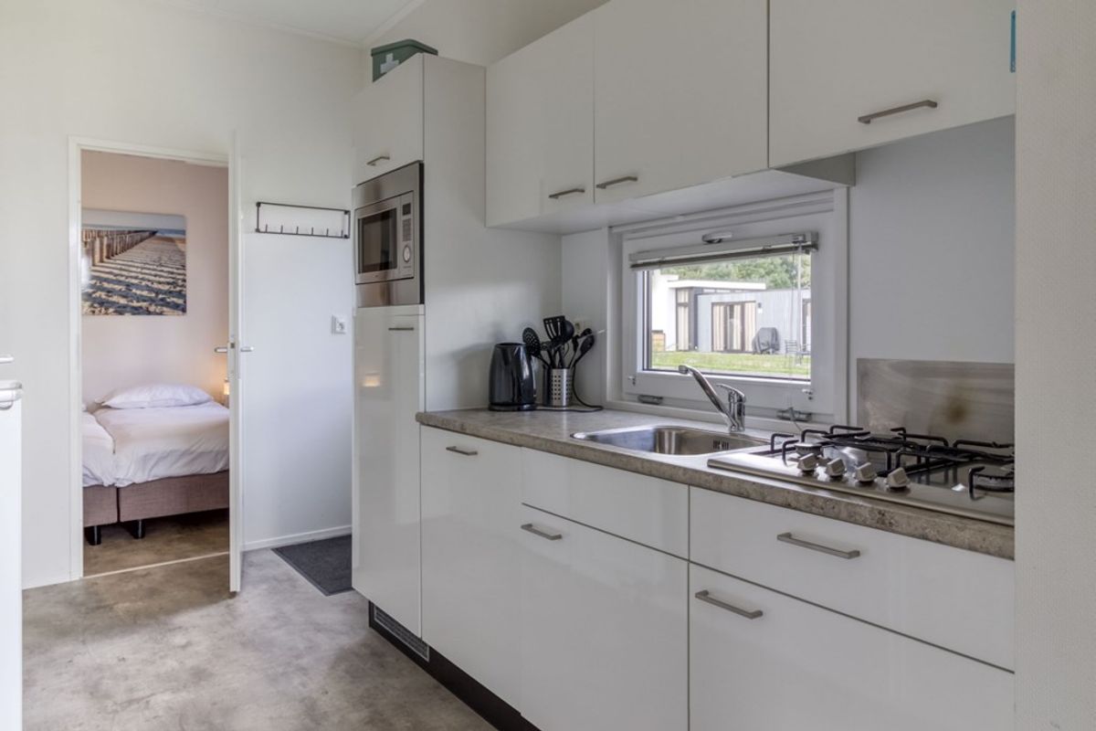 Naast de zithoek is er een eethoek en een open keuken die doorloopt in de hal. De keuken is voorzien van alle nodige inbouw-apparatuur en bestaat uit; 4-pits gas kookplaat, afzuigkap, combi- magnetron, koelkast met vriesvak, spoelbak en vaatwasmachine. Er zijn 2 slaapkamers, waarvan de grootste met inbouwkast. De badkamer is voorzien van douche, wastafel en toilet. De berging (2,53 m2) is van buitenaf bereikbaar en heeft een wasmachine-aansluiting. De afmetingen van de berging zijn 2,30 m bij 1.10 meter en daarmee voldoende groot voor het stallen van (elektrische) fietsen.