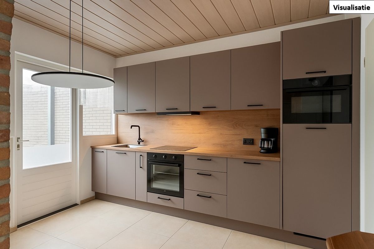 De sfeervolle woonkamer beschikt over een schouw, ideaal voor het plaatsen van een hout- of pelletkachel, en een mooie eiken vloer die zorgt voor een warme uitstraling. De halfopen keuken in rechte wandopstelling is voorzien van diverse inbouwapparatuur, waaronder een 4-pits keramische kookplaat, afzuigkap, oven en koelkast. Vanuit de keuken is toegang tot het brede overdekte terras, waar het heerlijk vertoeven is in alle seizoenen.