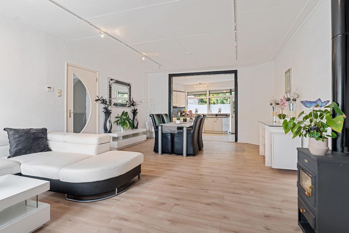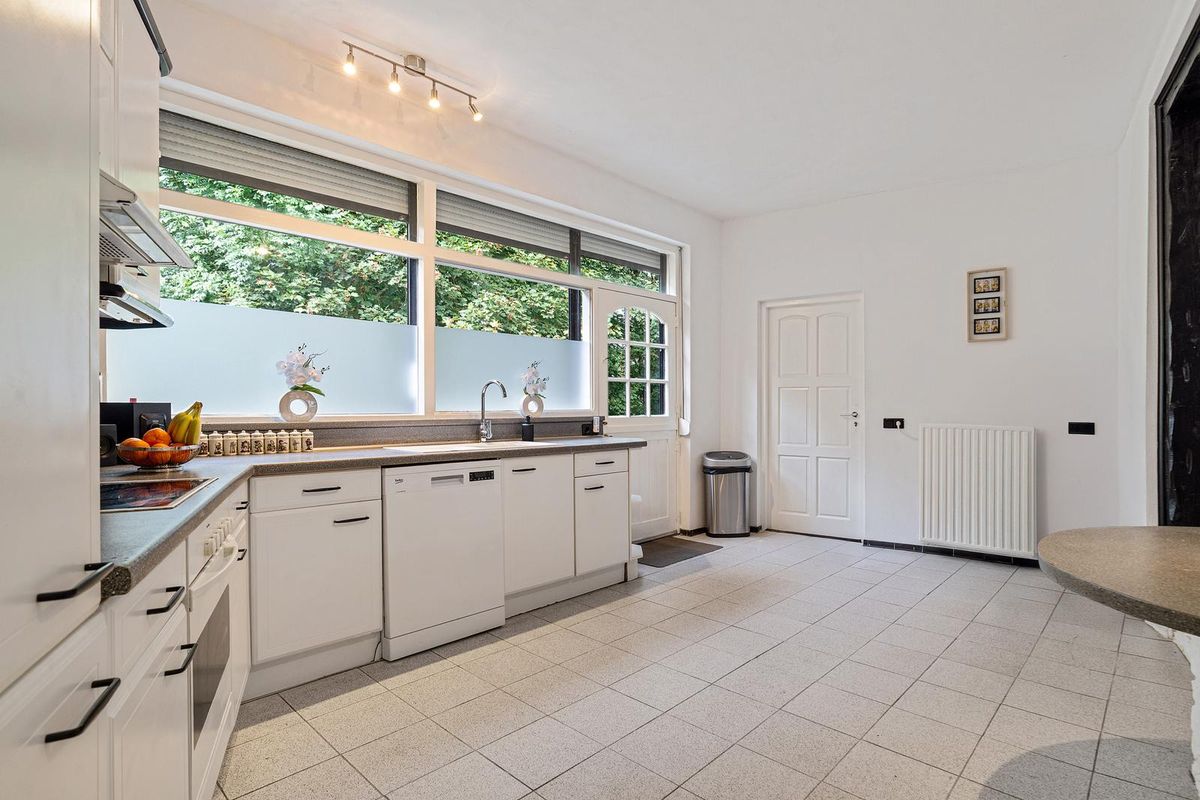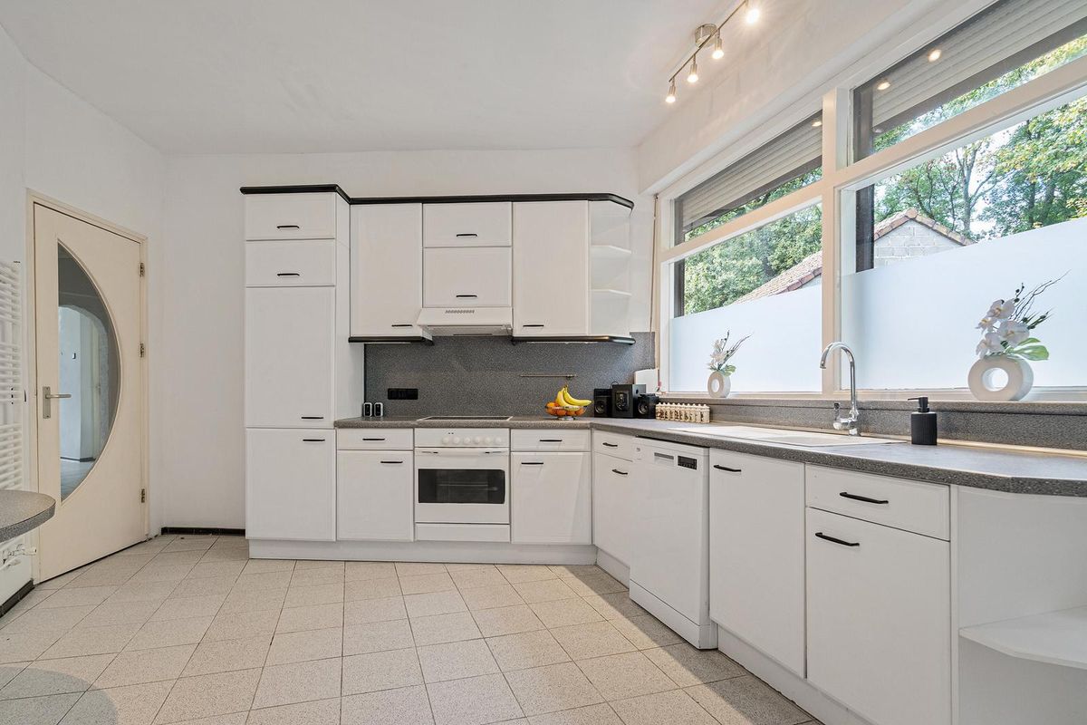 De keuken is te bereiken via een open doorgang met een kozijn die de ingang versmalt, geeft toegang tot de tuin en de loods. De keuken beschikt over een oven, inductiekookplaat, afzuigkap, spoelbak met kraan, vaatwasser, boven- en onderkasten en twee grote ramen die zorgen voor veel lichtinval.