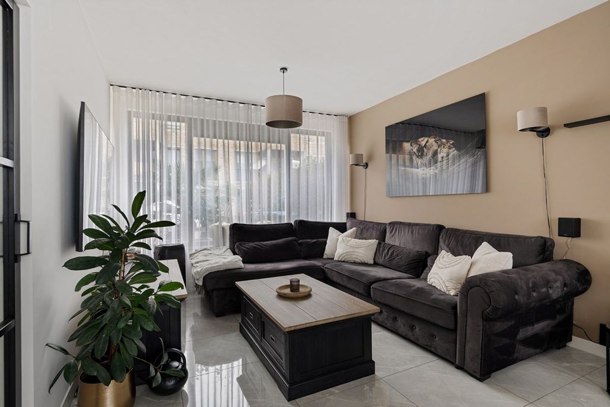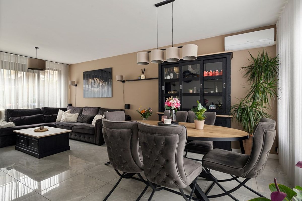 As you walk through the front garden and enter the house, you immediately notice how much living space it offers. The generous living room forms the heart of the home: beautifully bright thanks to large windows and with enough space for both a cozy seating area and a large dining table. Cooking takes place in the practical kitchen, which provides easy access to the garden perfect for those who like to move effortlessly from indoors to outdoors with a tray full of treats.