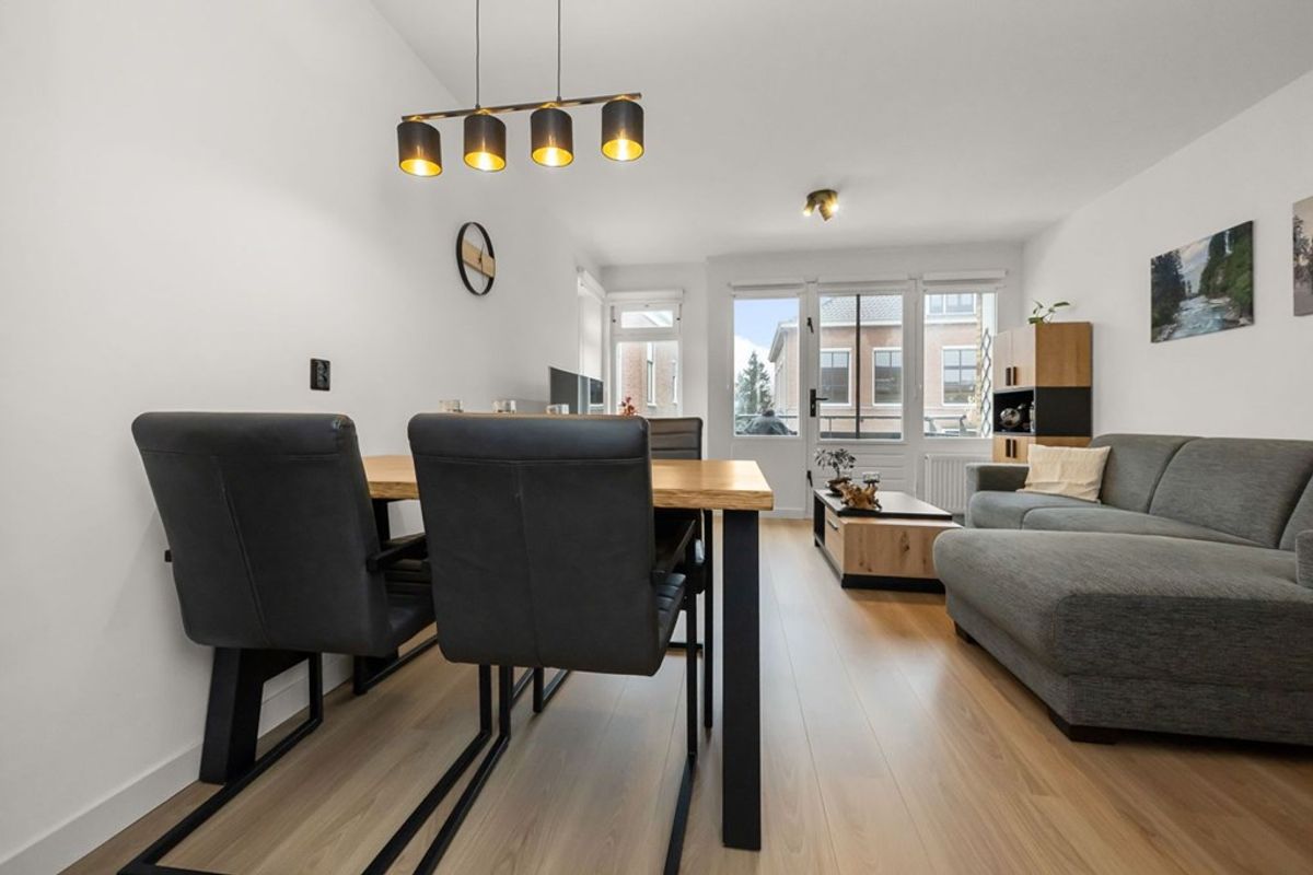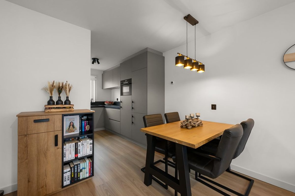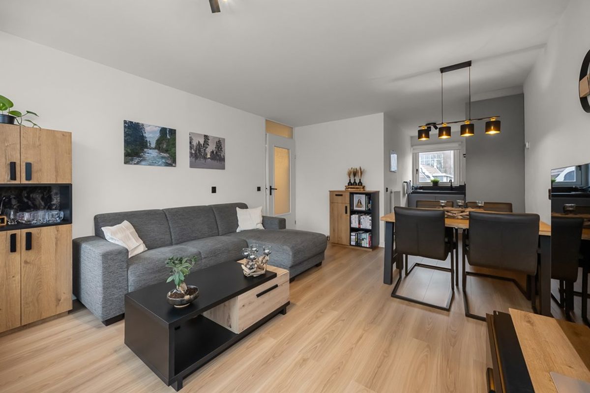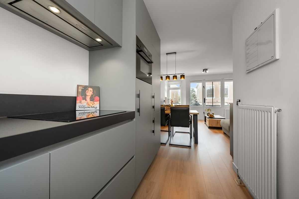Via de entree/hal kom je in de lichte woon-/eetkamer, waar de verzorgde afwerking en prettige lichtinval direct opvallen. De ruimte staat in open verbinding met de moderne halfopen keuken, die in 2022 is vernieuwd en is uitgevoerd in een praktische hoekopstelling.