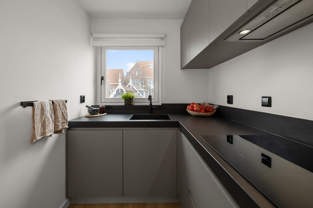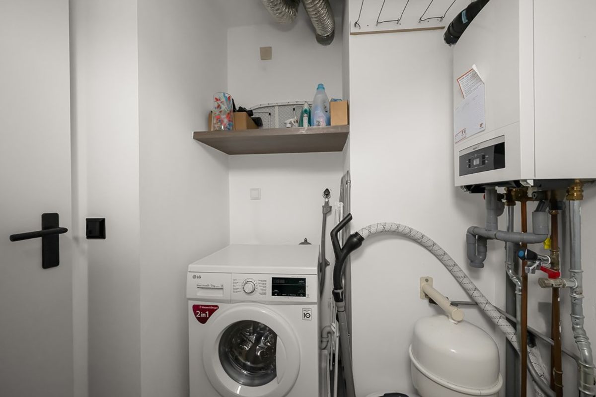 De keuken heeft diverse inbouwapparatuur, waaronder een combimagnetron, koelkast met vriesgedeelte, vaatwasser, Quooker en inductiekookplaat. Vanuit de woonkamer heb je toegang tot het balkon, een fijne plek om even buiten te zitten.