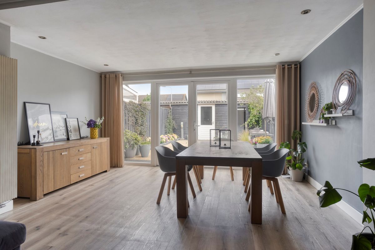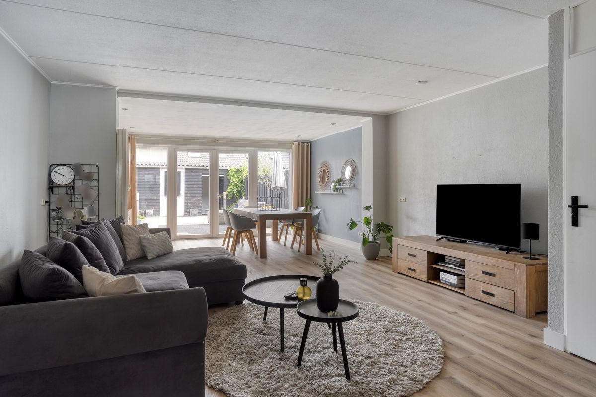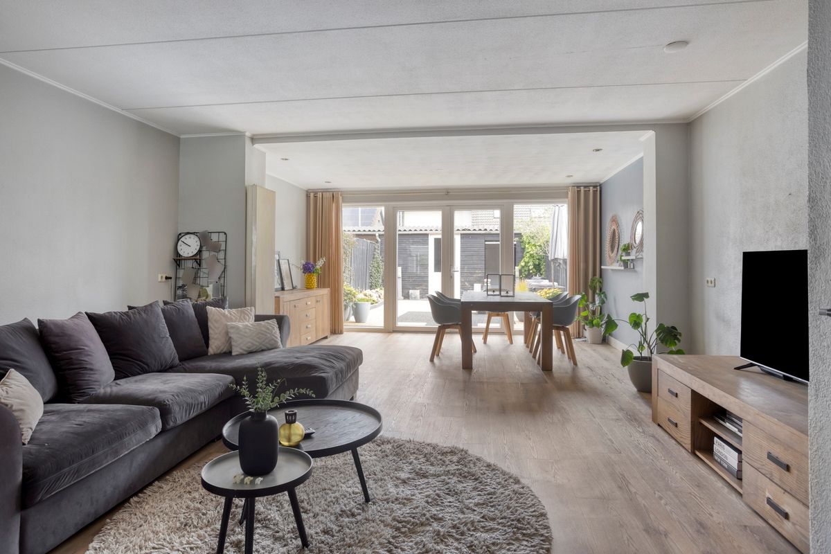 De woonkamer is uitgebouwd en voorzien van openslaande tuindeuren met kunststof kozijnen en HR++ glas. De woonkamer met veel lichtinval is netjes afgewerkt met inbouwspots en er is een designradiator aanwezig. De twee openslaande deuren geven toegang tot de tuin.