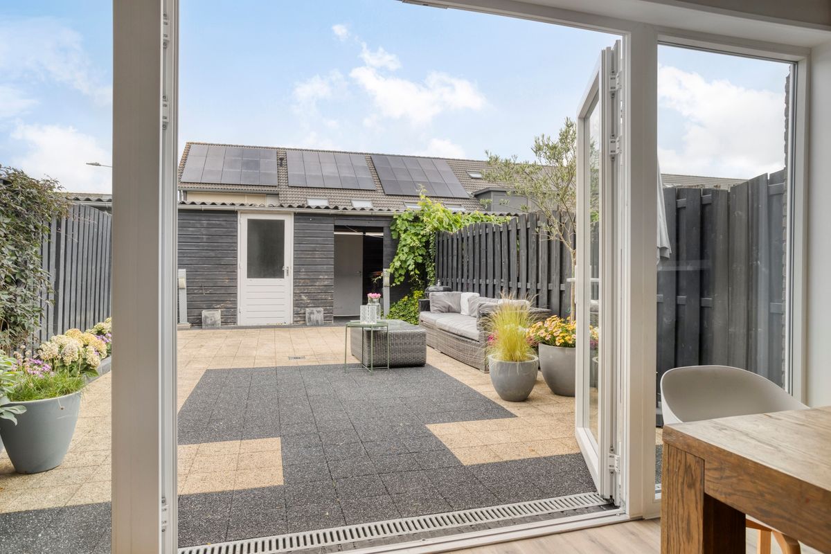 De fraai aangelegde achtertuin is gelegen op het noorden. De tuin is grotendeels betegeld en voorzien van mooie borders met prachtig gekleurde bloemen. Achter in de tuin is een houten berging met elektra aanwezig. Tevens heeft de woning een eigen achterom.