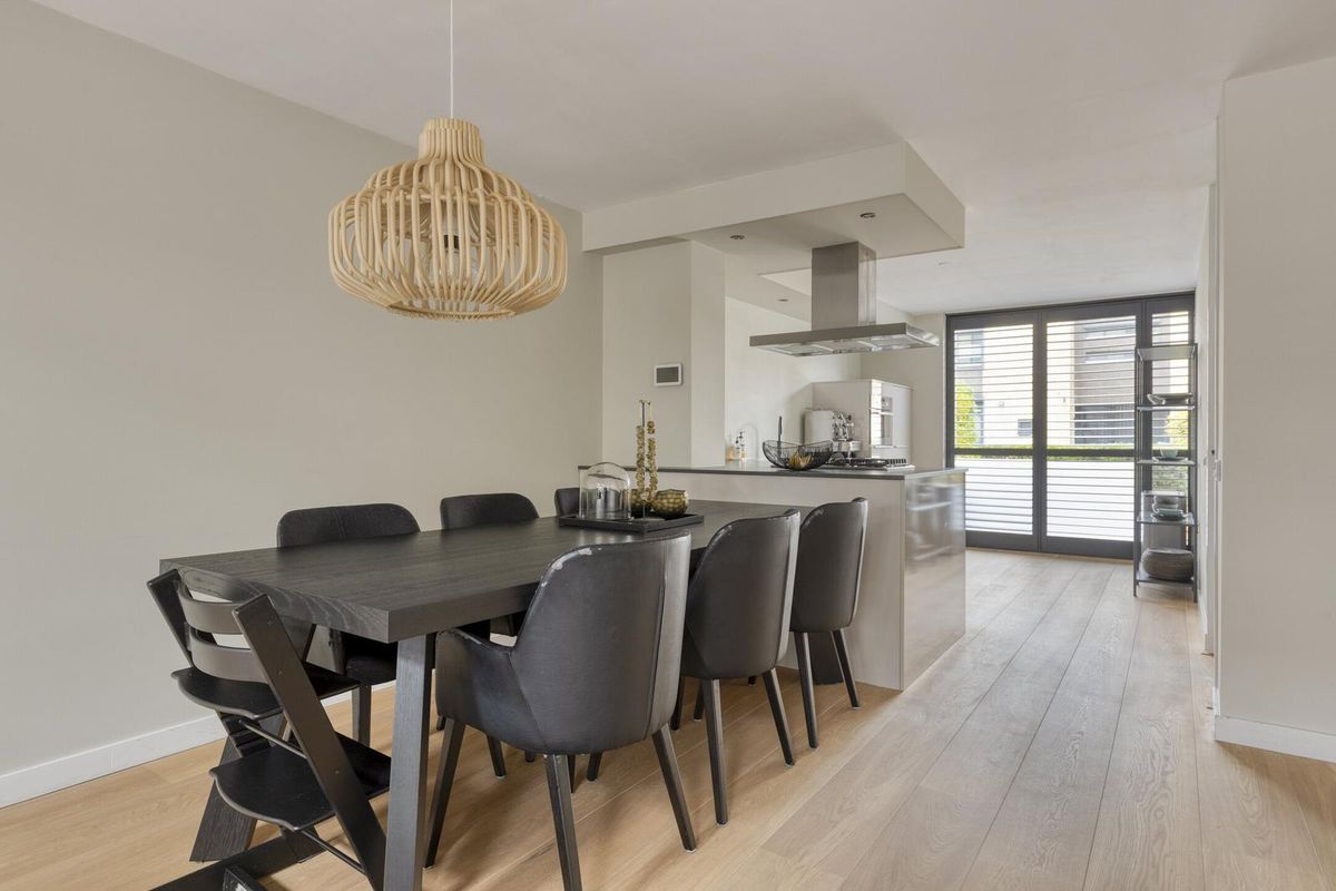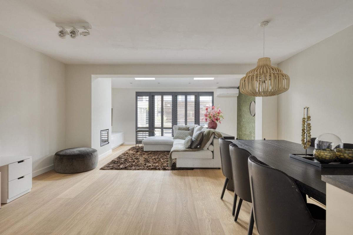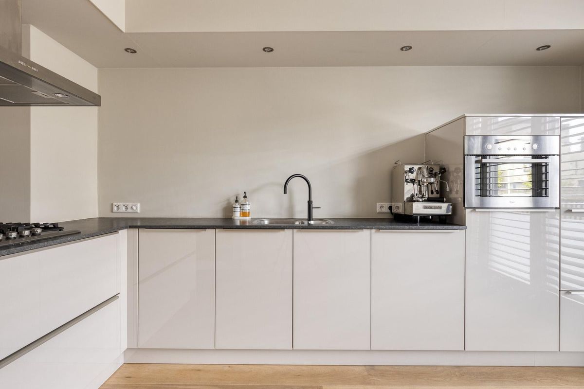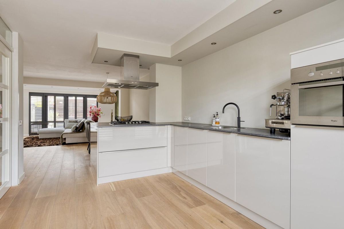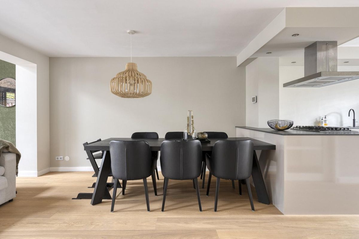 De woonkamer is echt het hart van de woning. Dankzij de grote raampartijen aan de achterzijde, twee extra dakramen én de ligging aan de tuin, baadt de ruimte in natuurlijk licht. De moderne zwarte shutters geven de woonkamer een luxe uitstraling en bieden tegelijk de mogelijkheid om het licht te temperen als je zin hebt in een knusse avond. De gezellige haard maakt het helemaal af, ideaal voor een ontspannen avond op de bank. De woonkamer vloeit moeiteloos over in de eetkamer, waar je met gemak een grote eettafel kwijt kunt. De perfecte plek voor lange diners met vrienden of een gezellige brunch met het gezin. De open keuken aan de voorzijde van de woning is strak en modern ingericht. Denk aan witte kastjes, een mooi werkblad en ingebouwde spotverlichting in het plafond. Hier vind je alles wat je nodig hebt: een combi-oven, koelkast, vriezer, vaatwasser (recent nieuwe geplaatst extra ruime en luxe) én een Quooker voor direct kokend water. Ook in de keuken zorgen de zwarte shutters voor een mooie mix van modern en sfeervol.